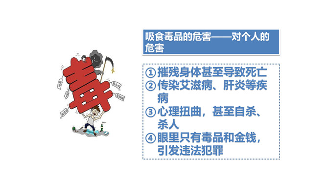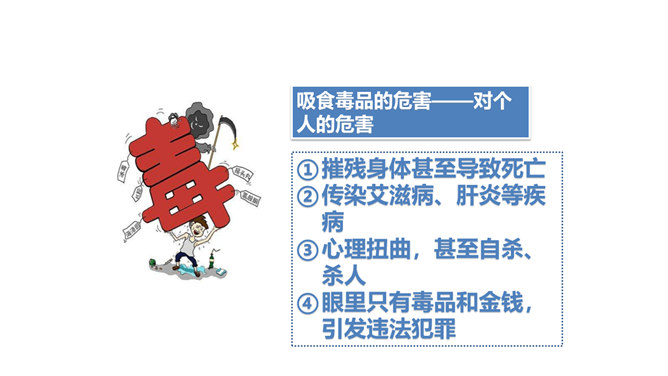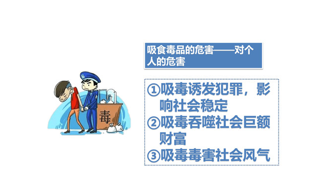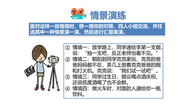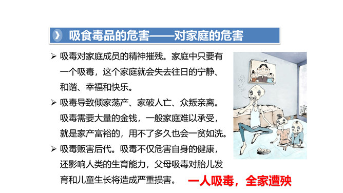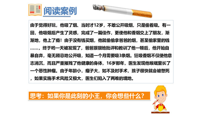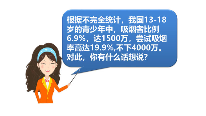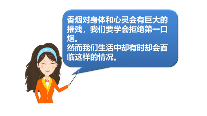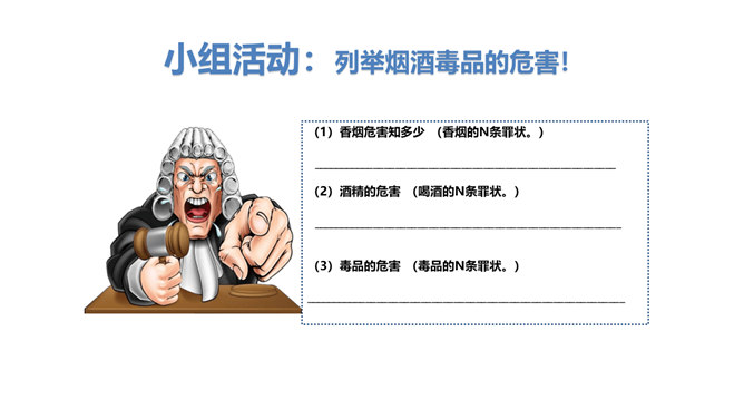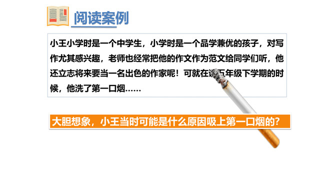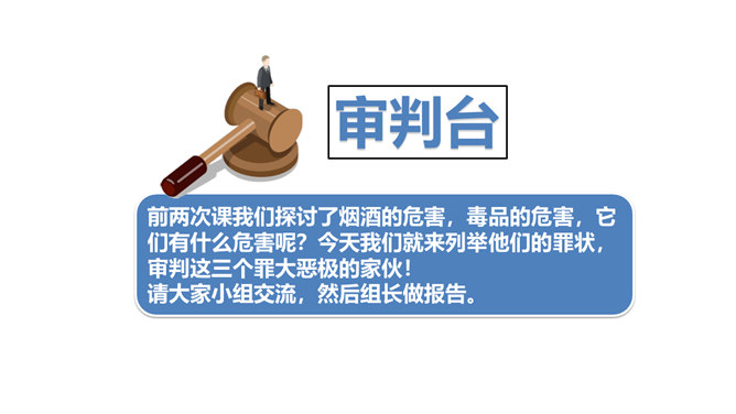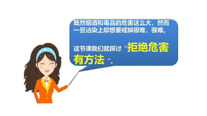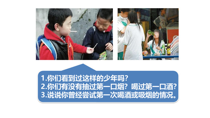 两次课我们探讨了烟酒的危害,毒品的危害,它们有什么危害呢?今天我们就来列举他们的罪状,审判这三个罪大恶极的家伙!请大家小组交流,然后组长做报告。既然烟酒和毒品的危害这么大,然而一旦沾染上却想要戒掉很难,很难。这节课我们就探讨“拒绝危害有方法“。1.你们看到过这样的少年吗?2.你们有没有抽过第一口烟?喝过第一口酒?3.说说你曾经尝试第一次喝酒或吸烟的情况。根据不完全统计,我国13-18岁的青少年中,吸烟者比例6.9%,达1500万,尝试吸烟率高达19.9%,不下4000万。 对此,你有什么话想说?所属专题:主动拒绝烟酒与毒品ppt。