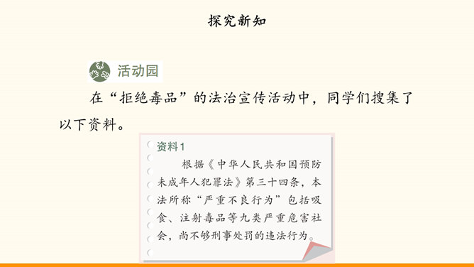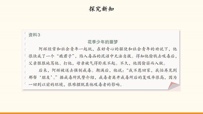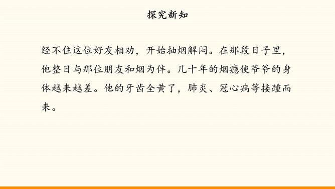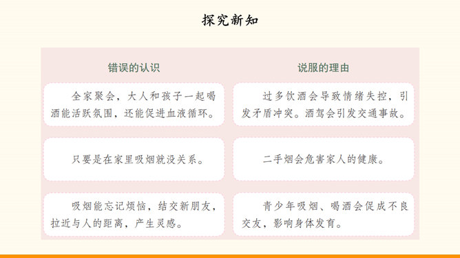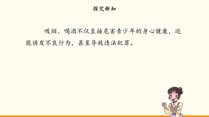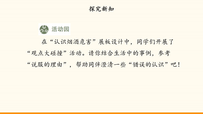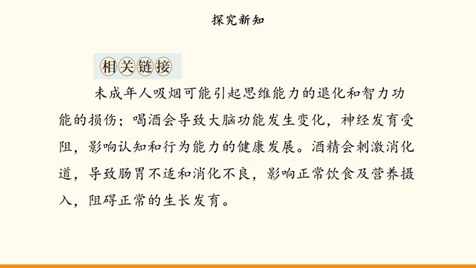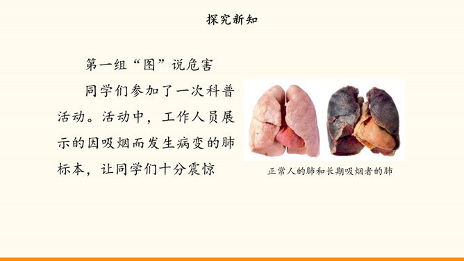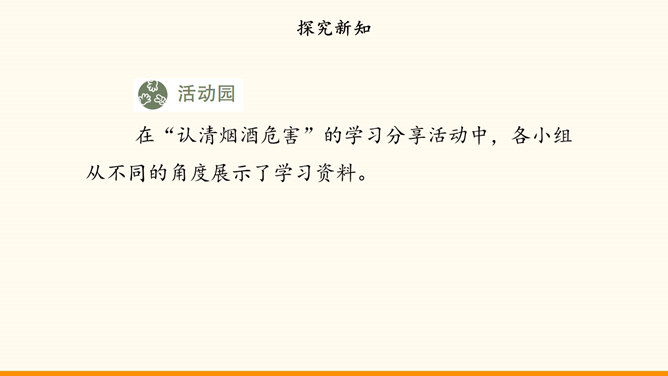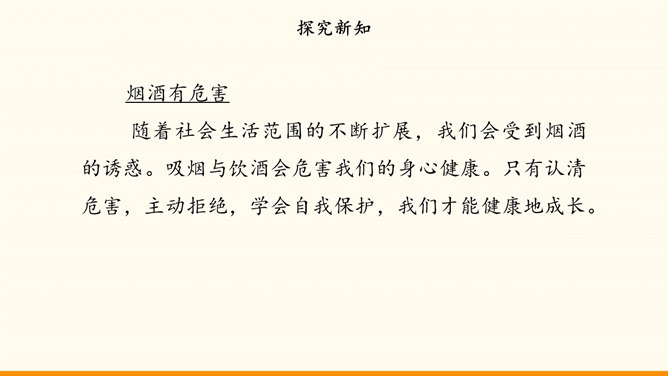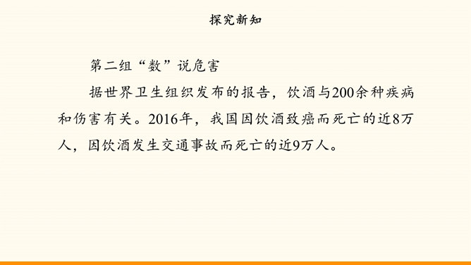 随着社会生活范围的不断扩展,我们会受到烟酒的诱惑。吸烟与饮酒会危害我们的身心健康。只有认清危害,主动拒绝,学会自我保护,我们才能健康地成长。在“认清烟酒危害”的学习分享活动中,各小组从不同的角度展示了学习资料。第一组“图”说危害。同学们参加了一次科普活动。活动中,工作人员展示的因吸烟而发生病变的肺标本,让同学们十分震惊。第二组“数”说危害。据世界卫生组织发布的报告,饮酒与200余种疾病和伤害有关。2016年,我国因饮酒致癌而死亡的近8万人,因饮酒发生交通事故而死亡的近9万人。所属专题:主动拒绝烟酒与毒品ppt。