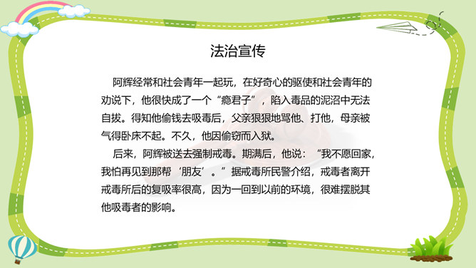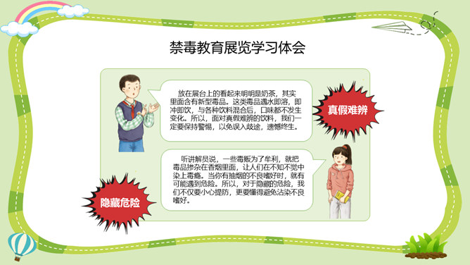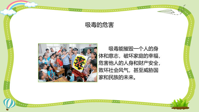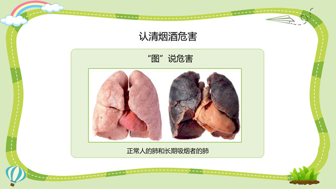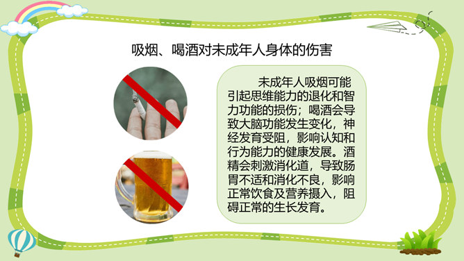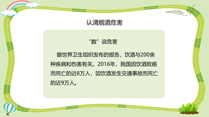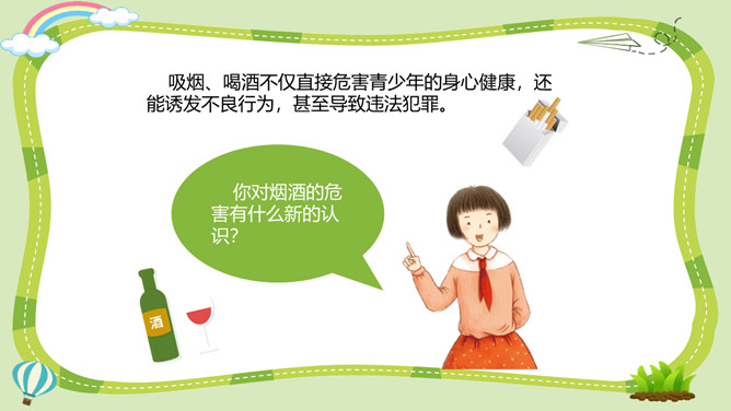 活动一:烟酒有危害。吸烟、喝酒不仅直接危害青少年的身心健康,还能诱发不良行为,甚至导致违法犯罪。你对烟酒的危害有什么新的认识?未成年人吸烟可能引起思维能力的退化和智力功能的损伤;喝酒会导致大脑功能发生变化,神经发育受阻,影响认知和行为能力的健康发展。酒精会刺激消化道,导致肠胃不适和消化不良,影响正常饮食及营养摄入,阻碍正常的生长发育。活动二:毒品更危险。吸毒能摧毁一个人的身体和意志,破坏家庭的幸福,危害他人的人身和财产安全,败坏社会风气,甚至威胁国家和民族的未来。所属专题:主动拒绝烟酒与毒品ppt。
