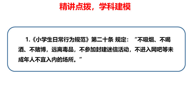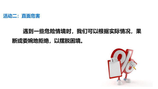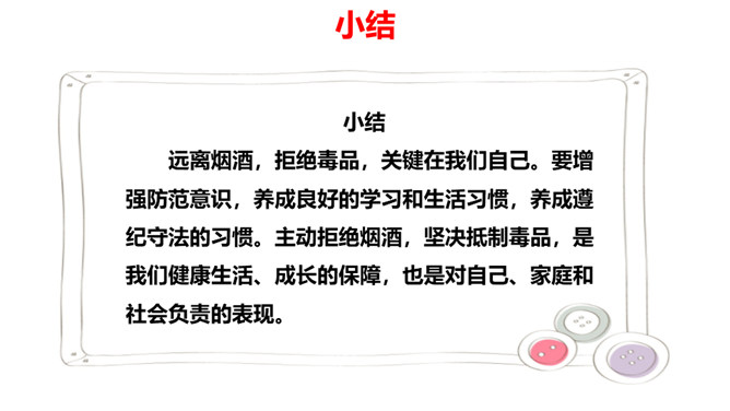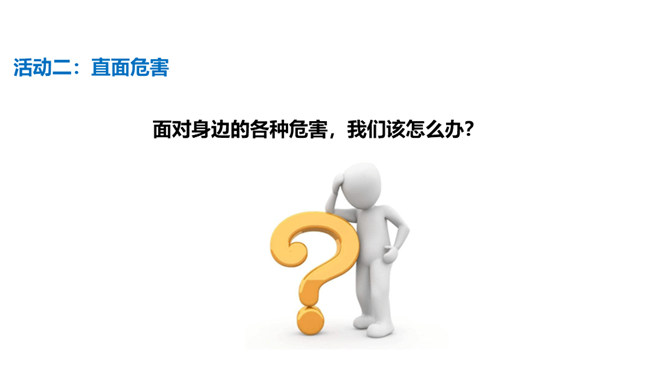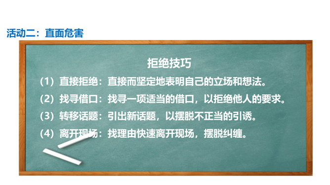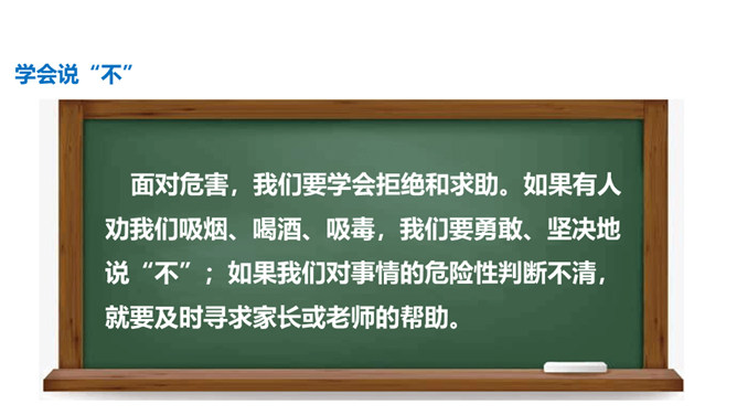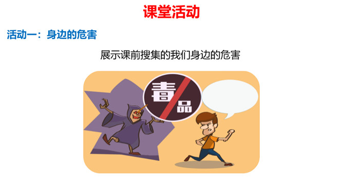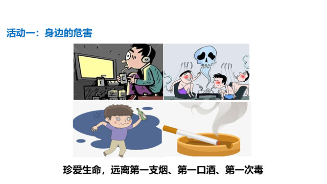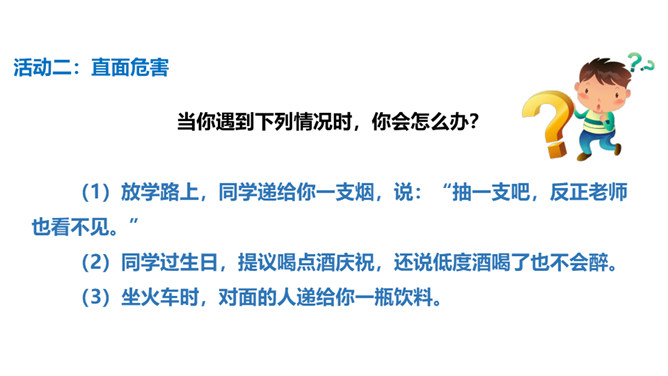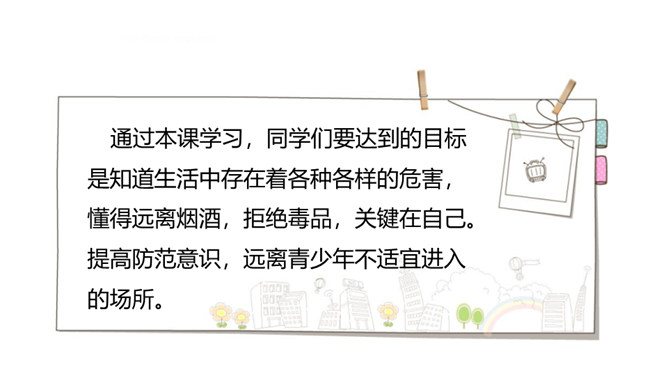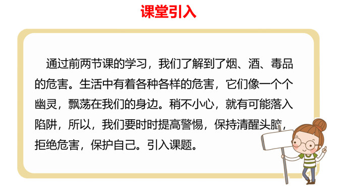 通过前两节课的学习,我们了解到了烟、酒、毒品的危害。生活中有着各种各样的危害,它们像一个个幽灵,飘荡在我们的身边。稍不小心,就有可能落入陷阱,所以,我们要时时提高警惕,保持清醒头脑,拒绝危害,保护自己。引入课题。通过本课学习,同学们要达到的目标是知道生活中存在着各种各样的危害,懂得远离烟酒,拒绝毒品,关键在自己。提高防范意识,远离青少年不适宜进入的场所。拒绝技巧:(1)直接拒绝:直接而坚定地表明自己的立场和想法。(2)找寻借口:找寻一项适当的借口,以拒绝他人的要求。所属专题:主动拒绝烟酒与毒品ppt。