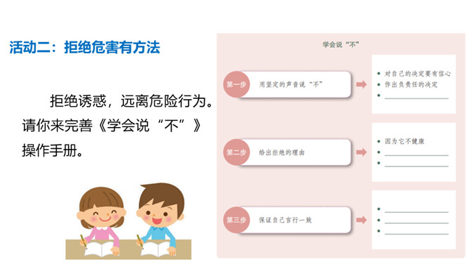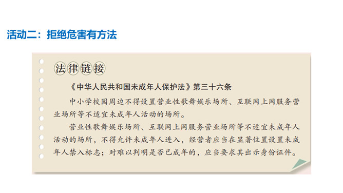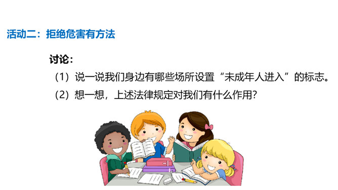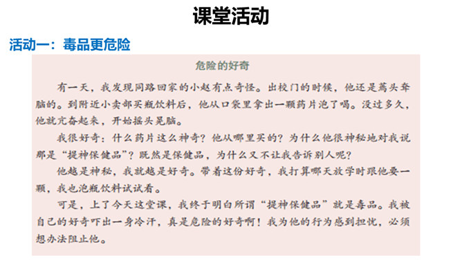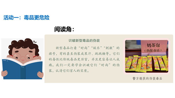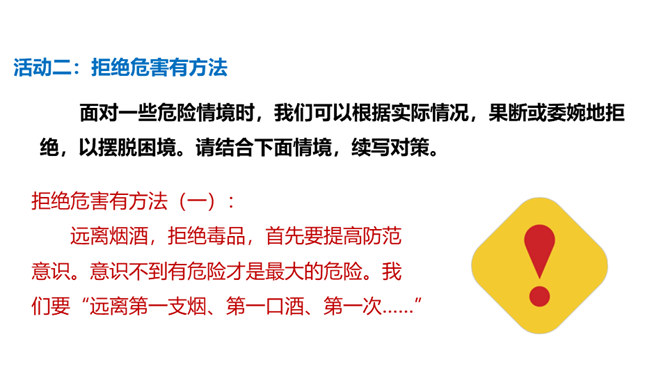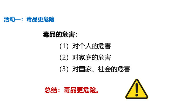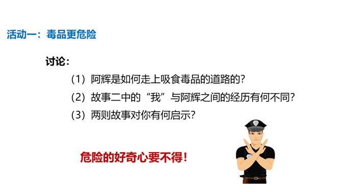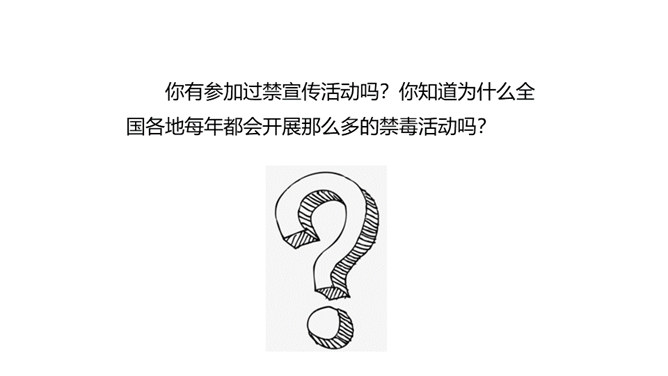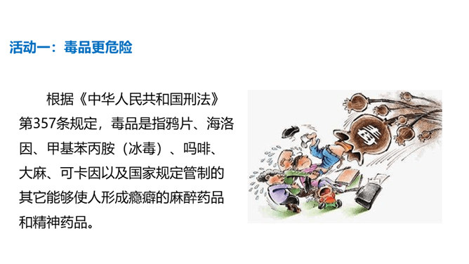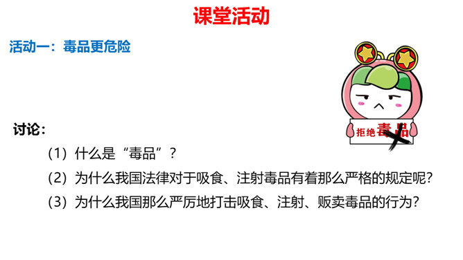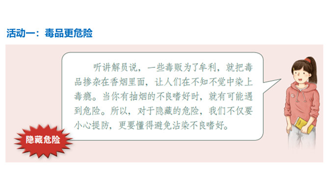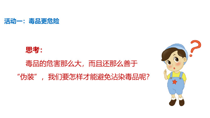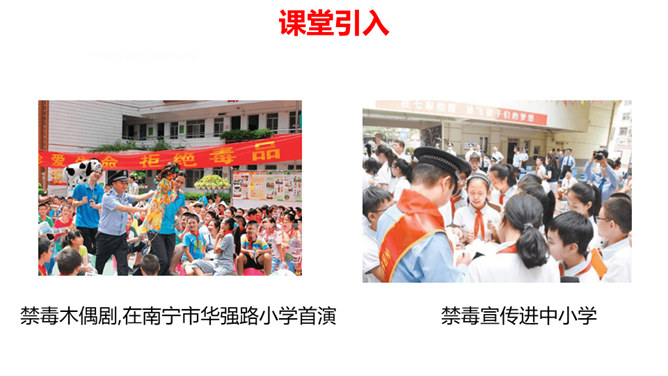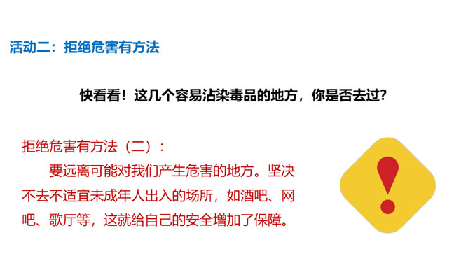 你有参加过禁宣传活动吗?你知道为什么全国各地每年都会开展那么多的禁毒活动吗?讨论:(1)什么是“毒品”?(2)为什么我国法律对于吸食、注射毒品有着那么严格的规定呢?(3)为什么我国那么严厉地打击吸食、注射、贩卖毒品的行为?毒品的危害那么大,而且还那么善于“伪装”,我们要怎样才能避免沾染毒品呢?面对一些危险情境时,我们可以根据实际情况,果断或委婉地拒绝,以摆脱困境。请结合下面情境,续写对策。快看看!这几个容易沾染毒品的地方,你是否去过?所属专题:主动拒绝烟酒与毒品ppt。