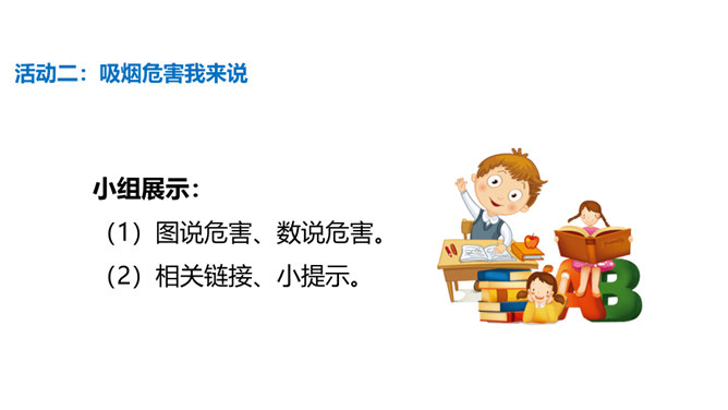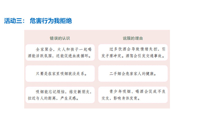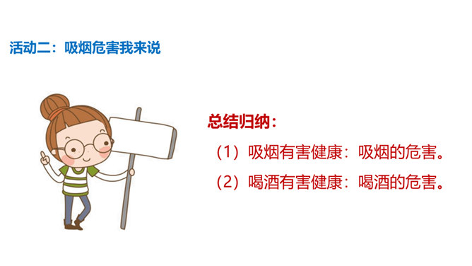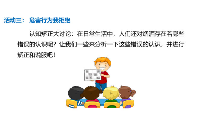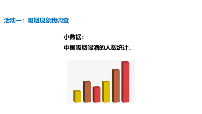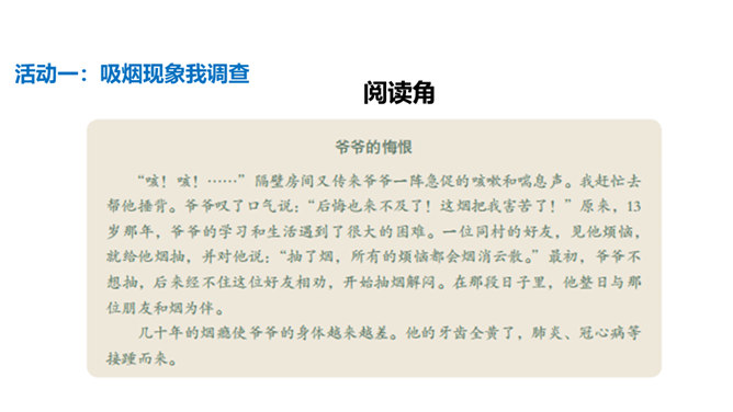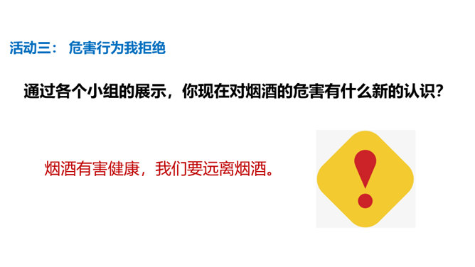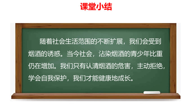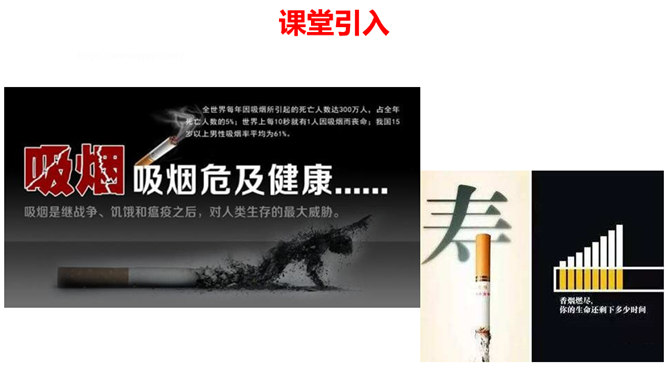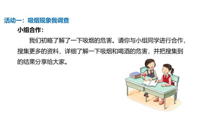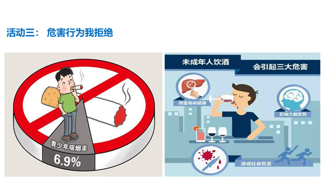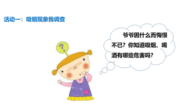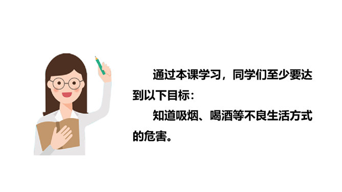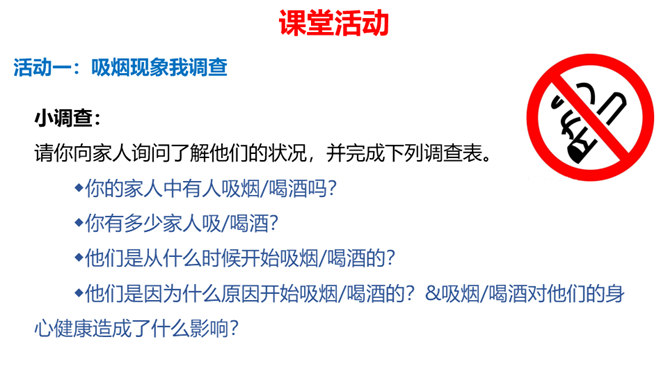 通过本课学习,同学们至少要达到以下目标:知道吸烟、喝酒等不良生活方式的危害。请你向家人询问了解他们的状况,并完成下列调查表。你的家人中有人吸烟/喝酒吗?你有多少家人吸/喝酒?他们是从什么时候开始吸烟/喝酒的?他们是因为什么原因开始吸烟/喝酒的?吸烟/喝酒对他们的身心健康造成了什么影响?爷爷因什么而悔恨不已?你知道吸烟、喝酒有哪些危害吗?我们初略了解了一下吸烟的危害。请你与小组同学进行合作,搜集更多的资料,详细了解一下吸烟和喝酒的危害,并把搜集到的结果分享给大家。所属专题:主动拒绝烟酒与毒品ppt。