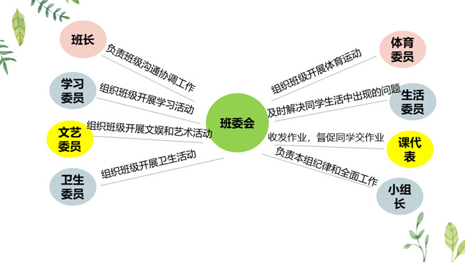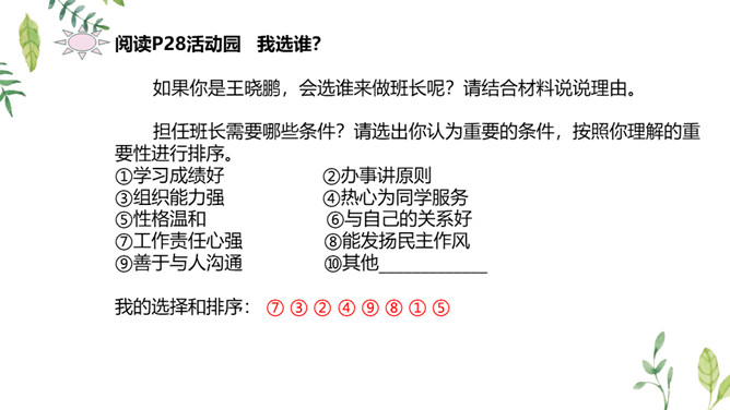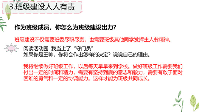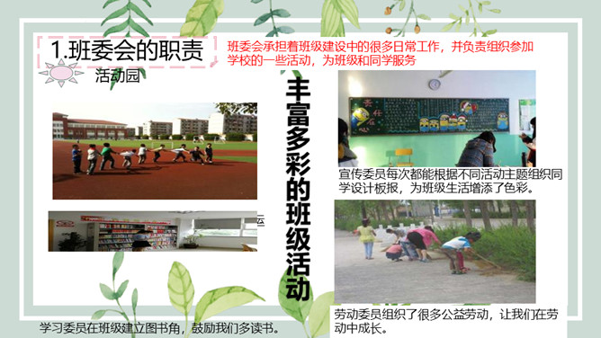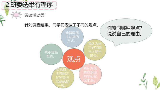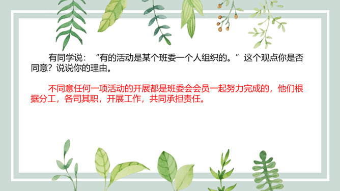 班委会承担着班级建设中的很多日常工作,并负责组织参加学校的一些活动,为班级和同学服务。宣传委员每次都能根据不同活动主题组织同学设计板报,为班级生活增添了色彩。学习委员在班级建立图书角,鼓励我们多读书。劳动委员组织了很多公益劳动,让我们在劳动中成长。有同学说:“有的活动是某个班委一个人组织的。”这个观点你是否同意?说说你的理由。不同意任何一项活动的开展都是班委会会员一起努力完成的,他们根据分工,各司其职,开展工作,共同承担责任。所属专题:选举产生班委会ppt。