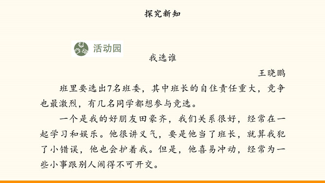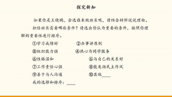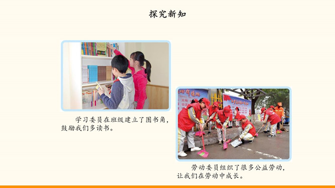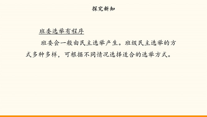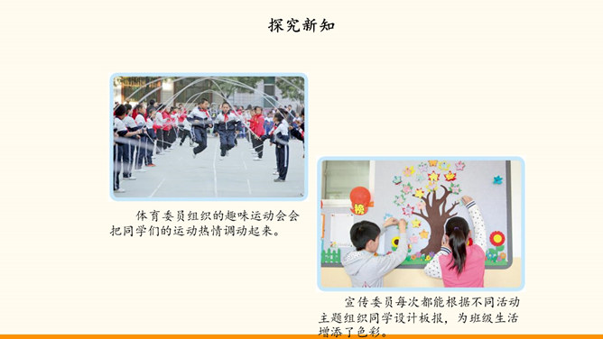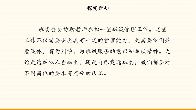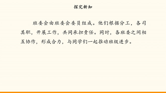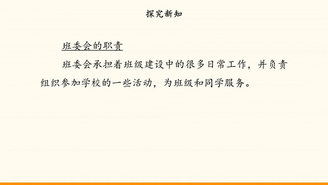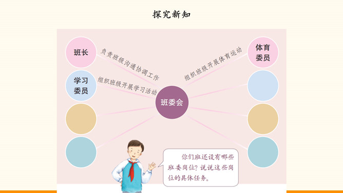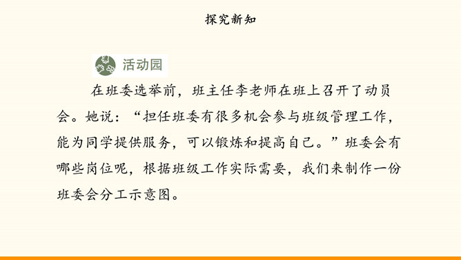 班委会承担着班级建设中的很多日常工作,并负责组织参加学校的一些活动,为班级和同学服务。回顾四年来班委会开展的工作时,同学们纷纷说起自己印象最深刻的活动。班委会由班委会委员组成。他们根据分工,各司其职,开展工作,共同承担责任。同时,各班委之间相互协作,形成合力,与同学们一起推动班级进步。在班委选举前,班主任李老师在班上召开了动员会。她说:“担任班委有很多机会参与班级管理工作,能为同学提供服务,可以锻炼和提高自己。”班委会有哪些岗位呢,根据班级工作实际需要,我们来制作一份班委会分工示意图。所属专题:选举产生班委会ppt。