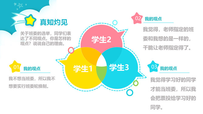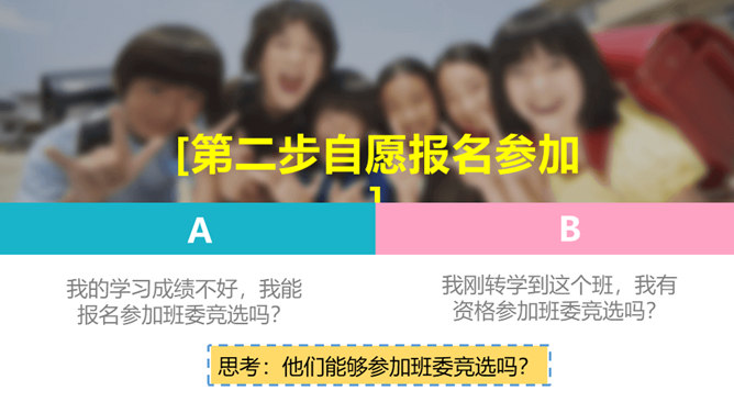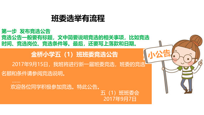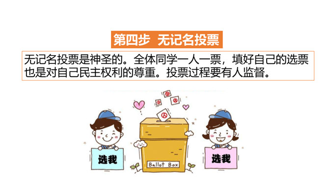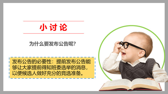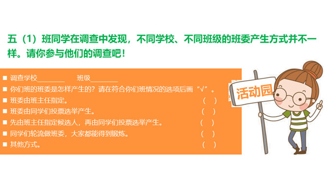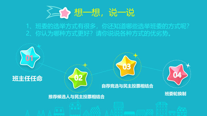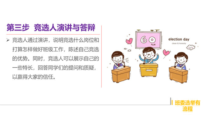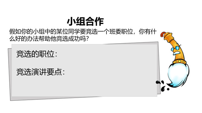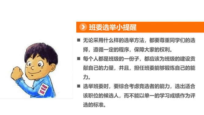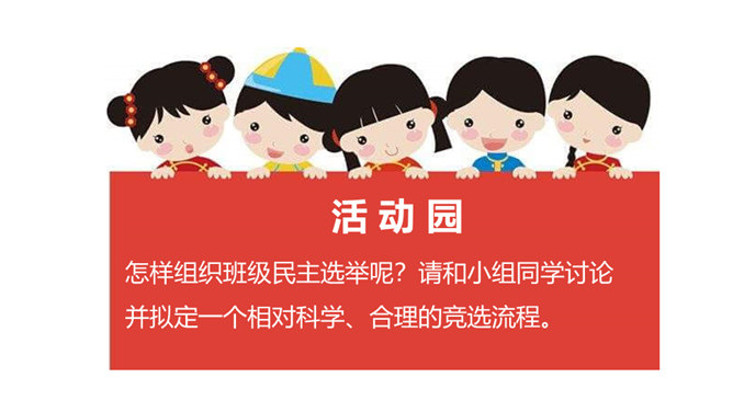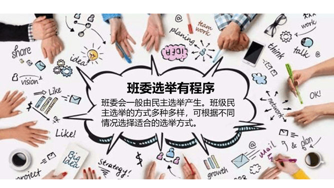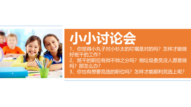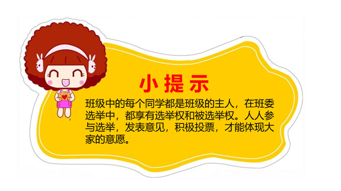 1、你觉得小丸子对小杉太的叮嘱是对的吗?怎样才能做好班干的工作?2、班干的职位有帅不帅之分吗?倒垃圾委员没人愿意做吗?那怎么办?3、你也有想要竞选的职位吗?怎样才能顺利竞选上呢?不同学校、不同班级的班委产生方式并不一样。请你参与他们的调查吧!1、班委的选举方式有很多,你还知道哪些选举班委的方式呢?2、你认为哪种方式更好?请你说说各种方式的优劣势。班委会一般由民主选举产生。班级民主选举的方式多种多样,可根据不同情况选择适合的选举方式。所属专题:选举产生班委会ppt。