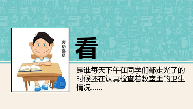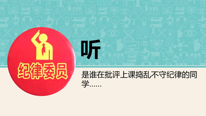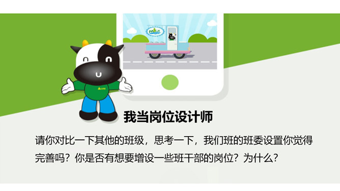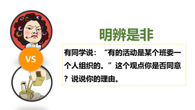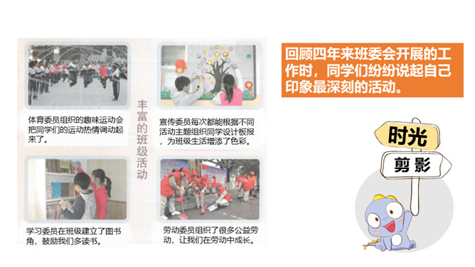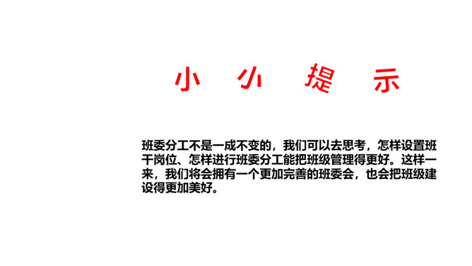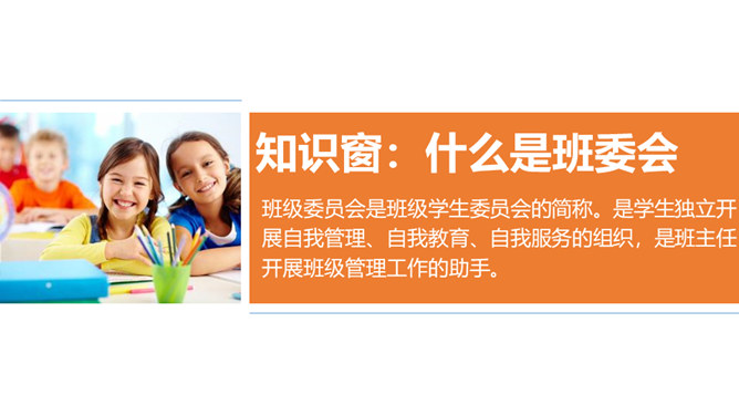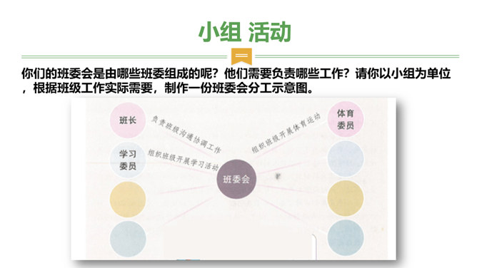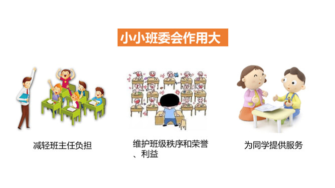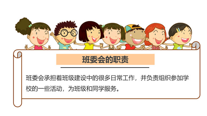 是谁每天下午在同学们都走光了的时候还在认真检查着教室里的卫生情况……是谁在批评上课捣乱不守纪律的同学……班级委员会是班级学生委员会的简称。是学生独立开展自我管理、自我教育、自我服务的组织,是班主任开展班级管理工作的助手。回顾四年来班委会开展的工作时,同学们纷纷说起自己印象最深刻的活动。1、与同学分享你印象最深刻的一次由班委会组织的活动。2、说一说,班委会对于班级而言有着怎样的重要作用?你们的班委会是由哪些班委组成的呢?他们需要负责哪些工作?所属专题:选举产生班委会ppt。