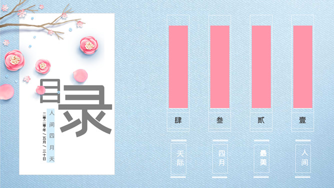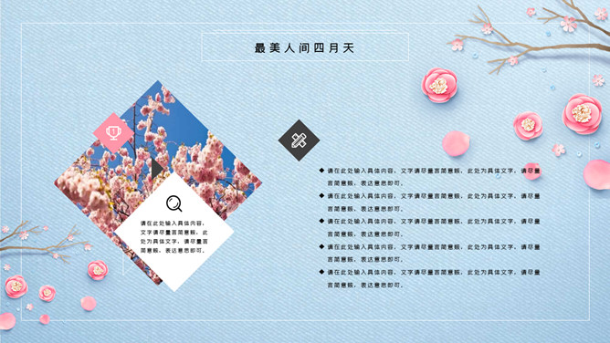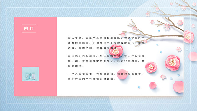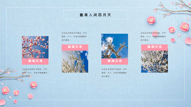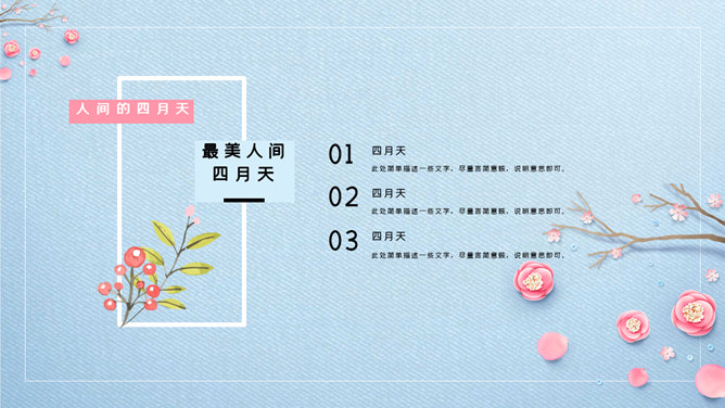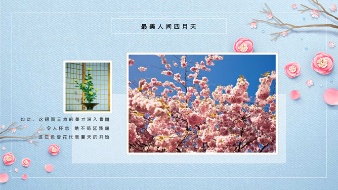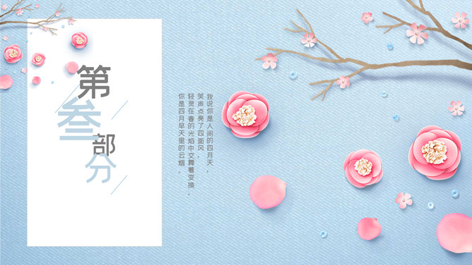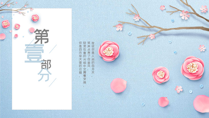 清新唯美蓝粉花朵PPT模板。一套精美清新幻灯片模板,唯美花朵、花枝装饰,蓝色配色,动态播放效果。