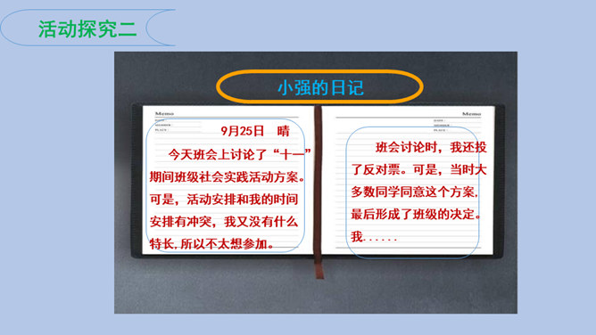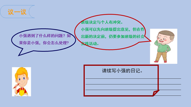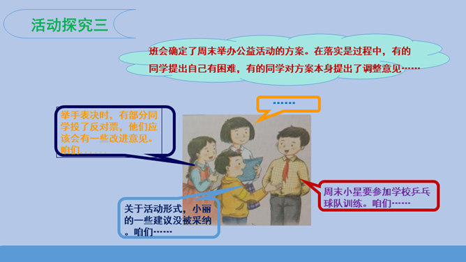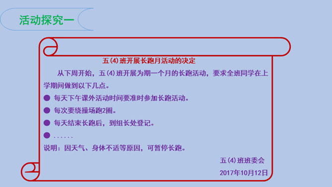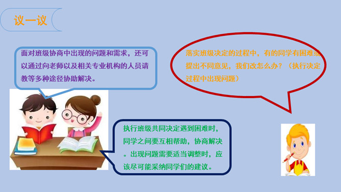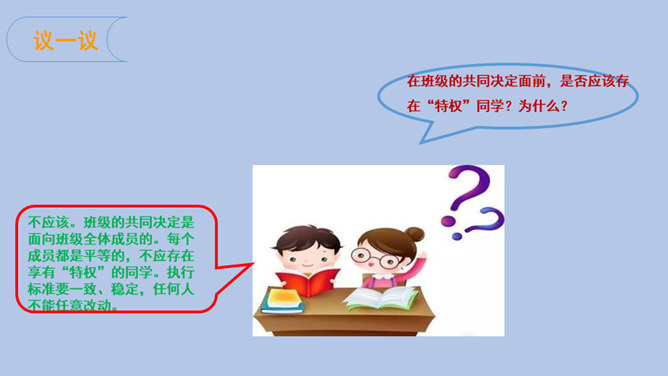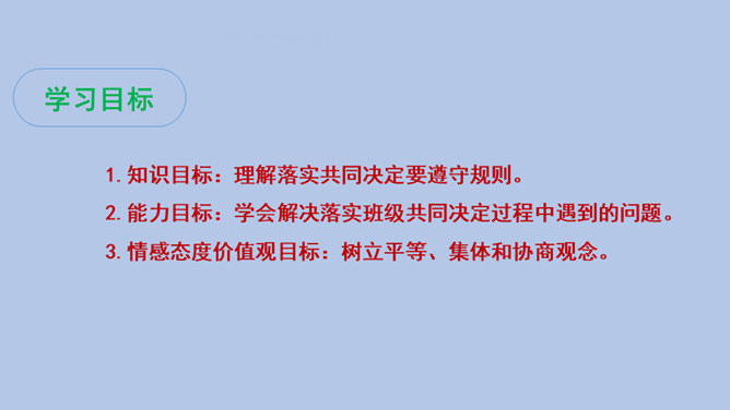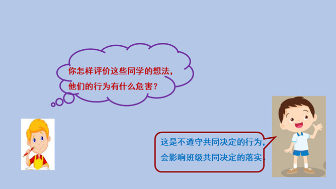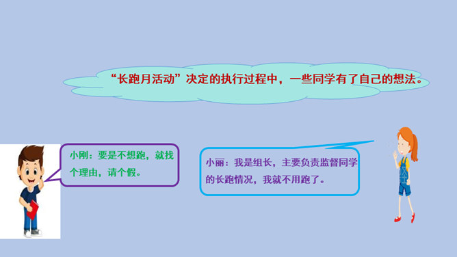 1.知识目标:理解落实共同决定要遵守规则。2.能力目标:学会解决落实班级共同决定过程中遇到的问题。3.情感态度价值观目标:树立平等、集体和协商观念。“长跑月活动”决定的执行过程中,一些同学有了自己的想法。小刚:要是不想跑,就找个理由,请个假。小丽:我是组长,主要负责监督同学的长跑情况,我就不用跑了。你怎样评价这些同学的想法,他们的行为有什么危害?这是不遵守共同决定的行为,会影响班级共同决定的落实。在班级的共同决定面前,是否应该存在“特权”同学?为什么?