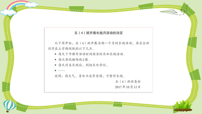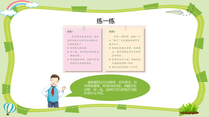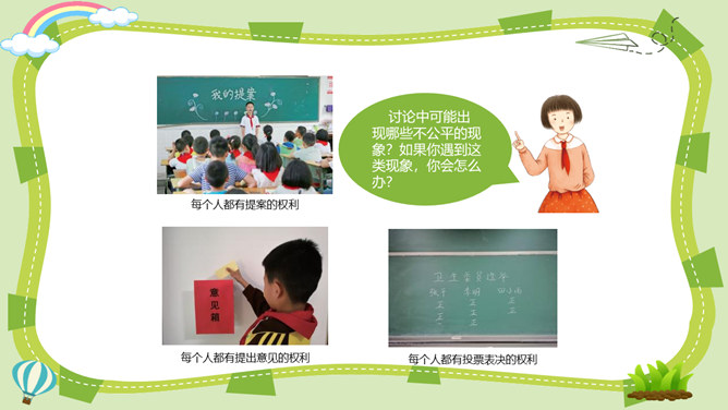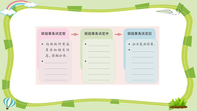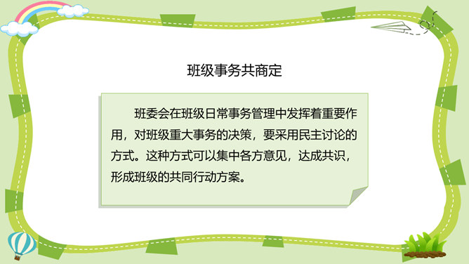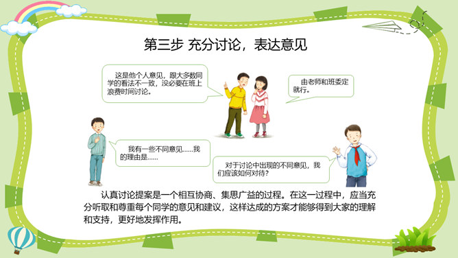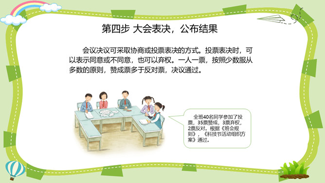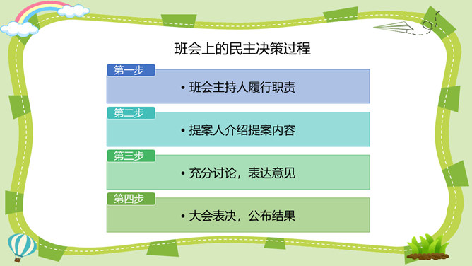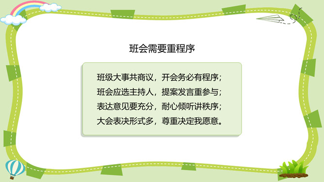 召开班会前要推选会议主持人。主持人宣布会议主题与议程,提醒大家应该注意的事项和需要遵守的规则。向班会提交议题和方案的人称为提案人,每个班级成员都可以成为提案人。提案要明确具体、简洁扼要。认真讨论提案是一个相互协商、集思广益的过程。在这一过程中,应当充分听取和尊重每个同学的意见和建议,这样达成的方案才能够得到大家的理解和支持,更好地发挥作用。会议决议可采取协商或投票表决的方式。投票表决时,可以表示同意或不同意,也可以弃权。一人一票,按照少数服从多数的原则,赞成票多于反对票,决议通过。