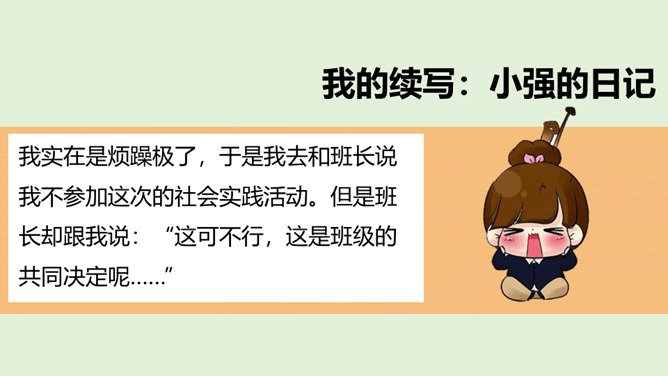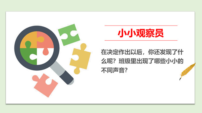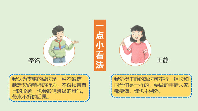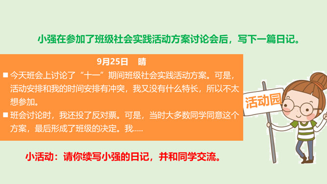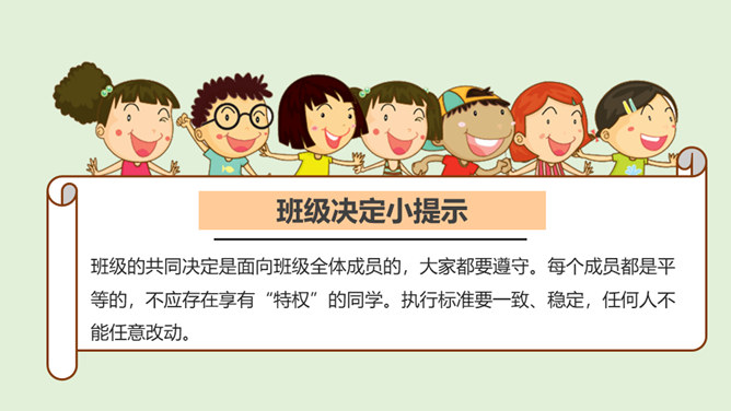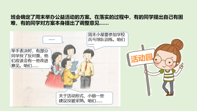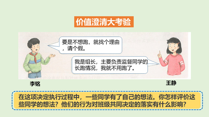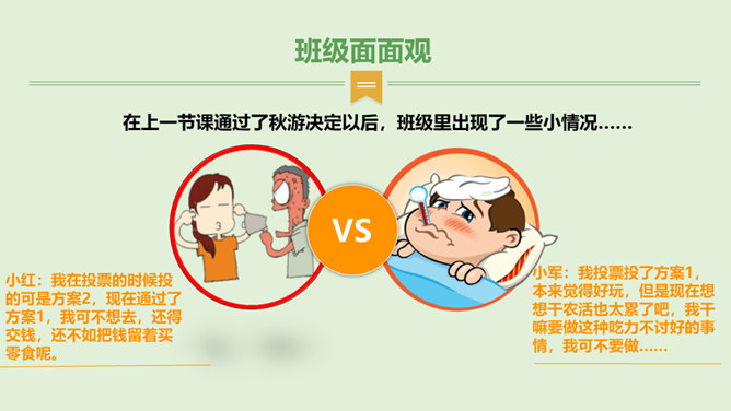 在上一节课通过了秋游决定以后,班级里出现了一些小情况……小红:我在投票的时候投的可是方案2,现在通过了方案1,我可不想去,还得交钱,还不如把钱留着买零食呢。小军:我投票投了方案1,本来觉得好玩,但是现在想想干农活也太累了吧,我干嘛要做这种吃力不讨好的事情,我可不要做……在决定作出以后,你还发现了什么呢?班级里出现了哪些小小的不同声音?遇到这些情况,我们应该怎么做呢?班级成员集体形成的最终决定在班级中具有约束力。每个成员都要遵守共同的决定,并落实在行动中。