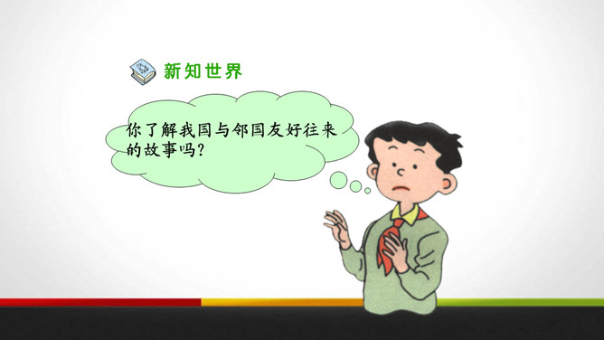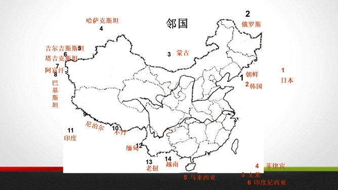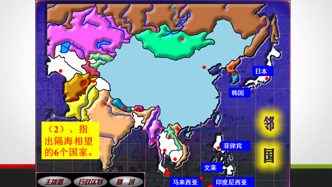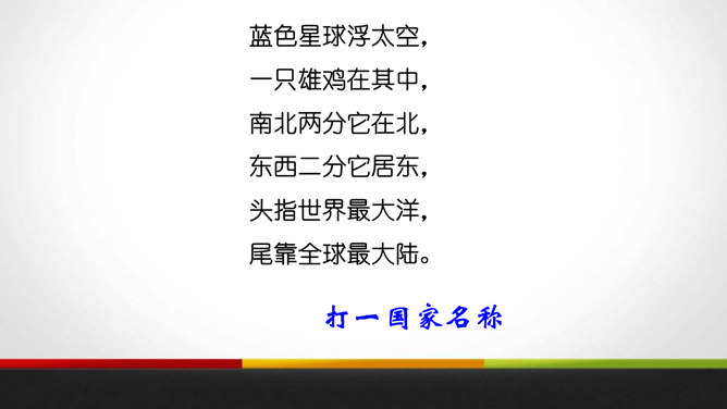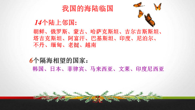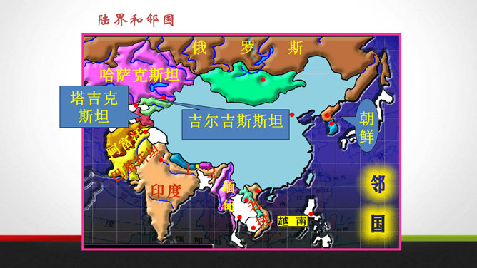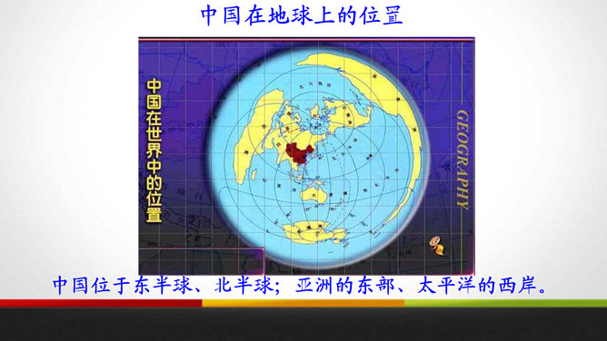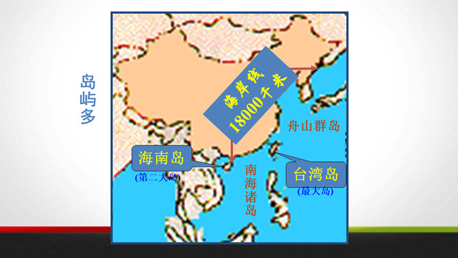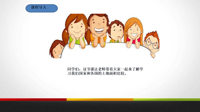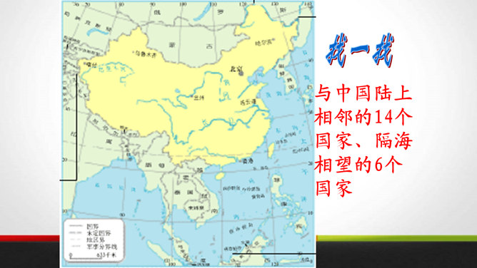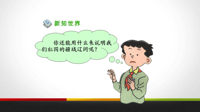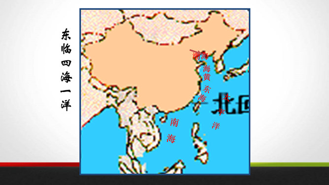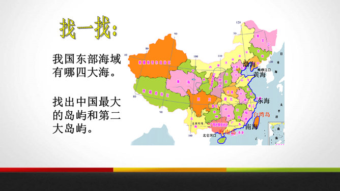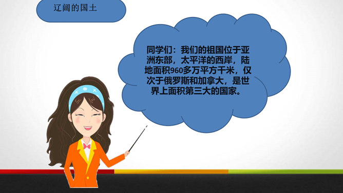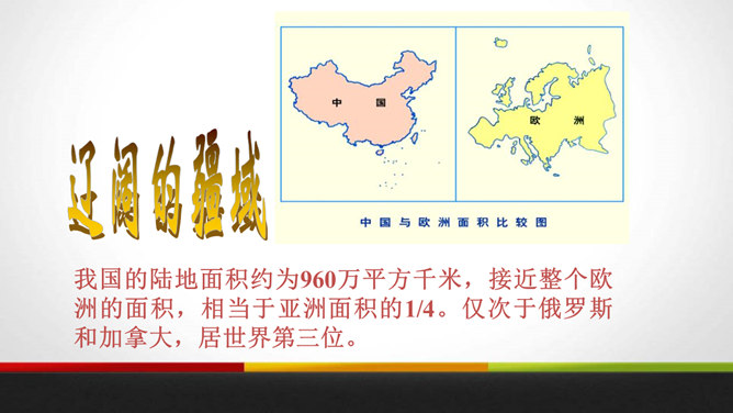 同学们:我们的祖国位于亚洲东部,太平洋的西岸,陆地面积960多万平方千米,仅次于俄罗斯和加拿大,是世界上面积第三大的国家。节课让老师带着大家一起来了解学习我们国家和各国的土地面积比较。中国位于东半球、北半球;亚洲的东部、太平洋的西岸。我国的陆地面积约为960万平方千米,接近整个欧洲的面积,相当于亚洲面积的1/4。仅次于俄罗斯和加拿大,居世界第三位。你还能用什么来说明我们祖国的疆域辽阔呢?找一找:我国东部海域有哪四大海。找出中国最大的岛屿和第二大岛屿。所属专题:我们神圣的国土ppt。