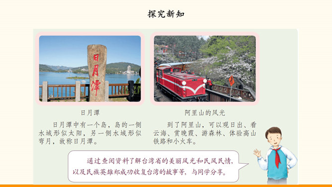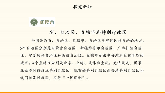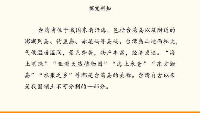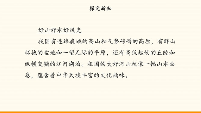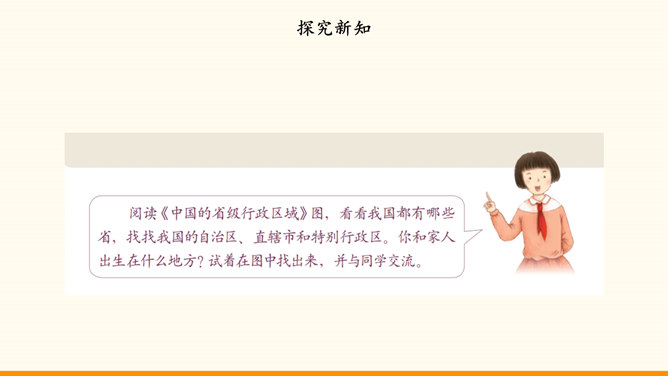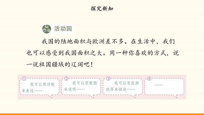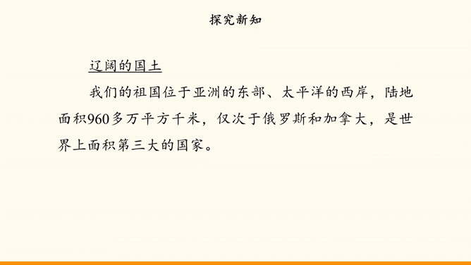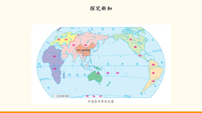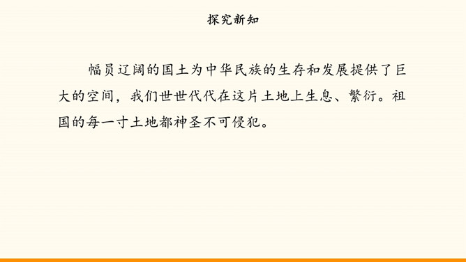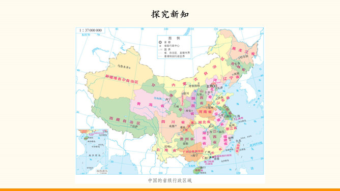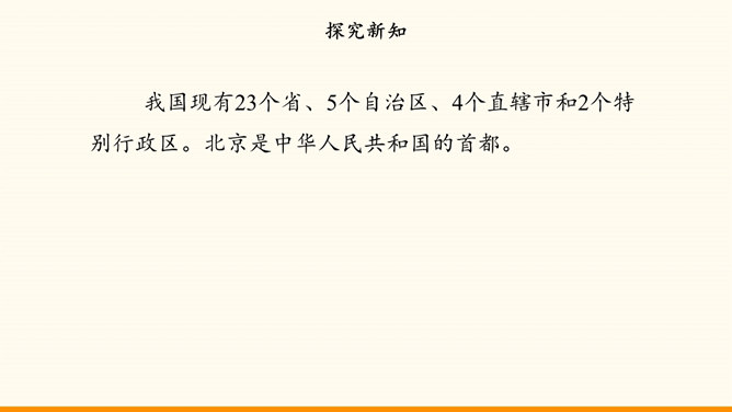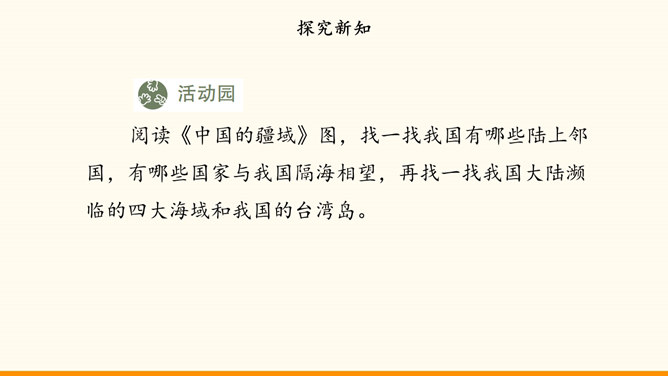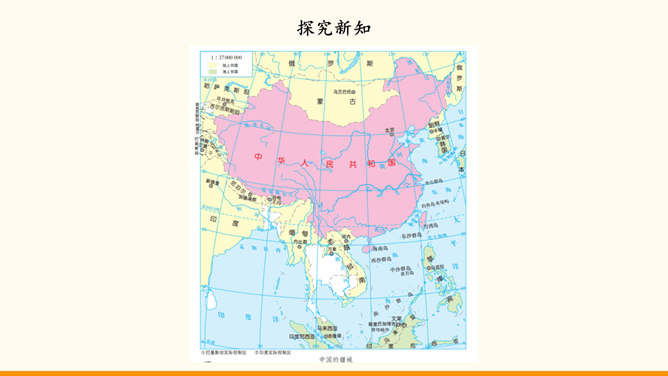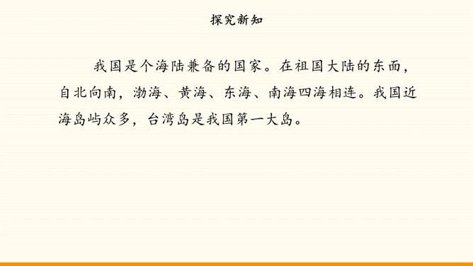 我国的陆地面积与欧洲差不多。在生活中,我们也可以感受到我国面积之大。用一种你喜欢的方式,说一说祖国疆域的辽阔吧!我国是个海陆兼备的国家。在祖国大陆的东面,自北向南,渤海、黄海、东海、南海四海相连。我国近海岛屿众多,台湾岛是我国第一大岛。找一找我国有哪些陆上邻国,有哪些国家与我国隔海相望,再找一找我国大陆濒临的四大海域和我国的台湾岛。我国现有23个省、5个自治区、4个直辖市和2个特别行政区。北京是中华人民共和国的首都。所属专题:我们神圣的国土ppt。