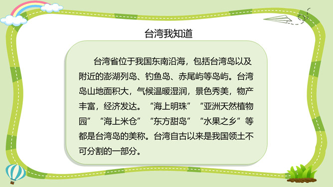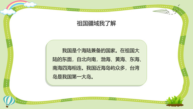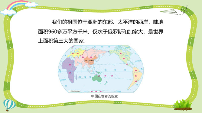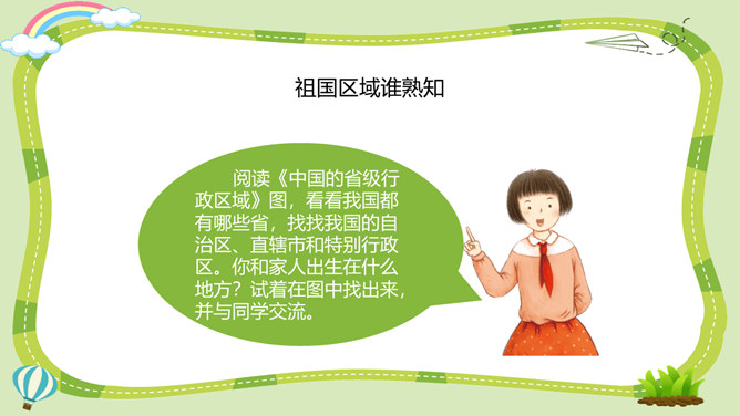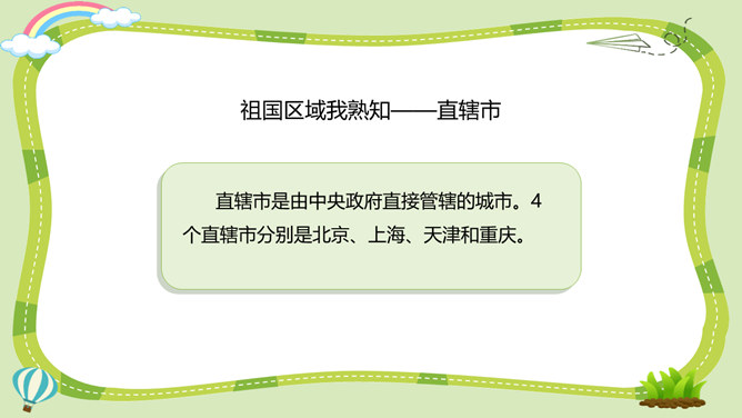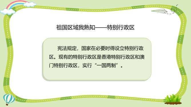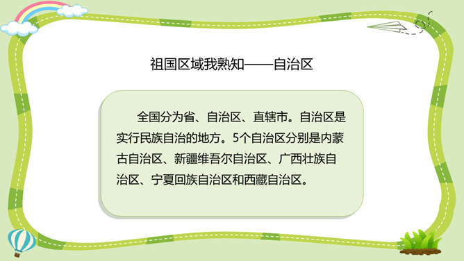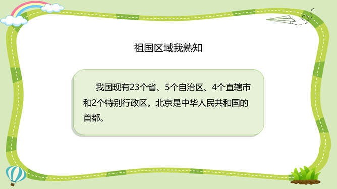 我国现有23个省、5个自治区、4个直辖市和2个特别行政区。北京是中华人民共和国的首都。全国分为省、自治区、直辖市。自治区是实行民族自治的地方。5个自治区分别是内蒙古自治区、新疆维吾尔自治区、广西壮族自治区、宁夏回族自治区和西藏自治区。直辖市是由中央政府直接管辖的城市。4个直辖市分别是北京、上海、天津和重庆。宪法规定,国家在必要时得设立特别行政区。现有的特别行政区是香港特别行政区和澳门特别行政区,实行“一国两制”。幅员辽阔的国土为中华民族的生存和发展提供了巨大的空间。所属专题:我们神圣的国土ppt。