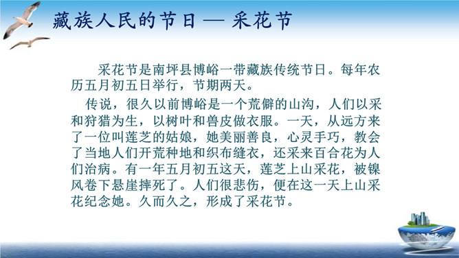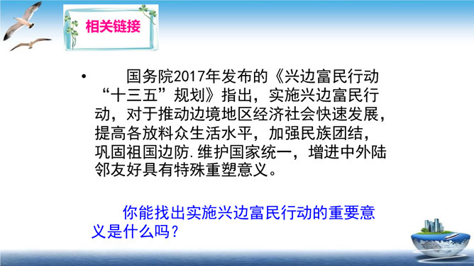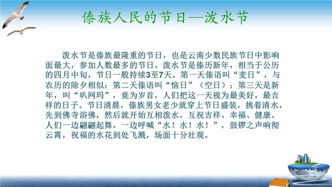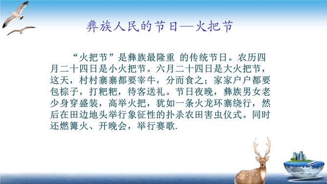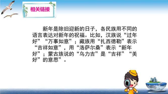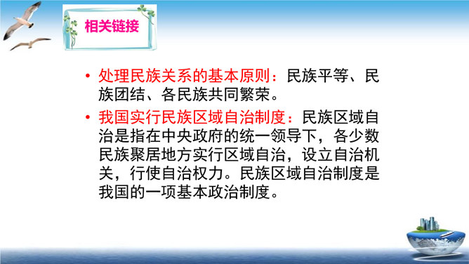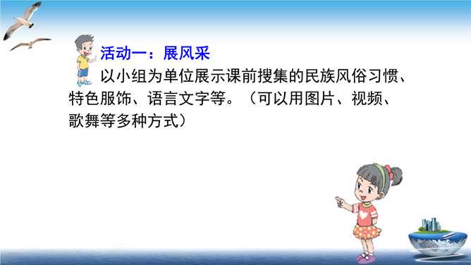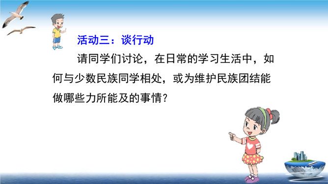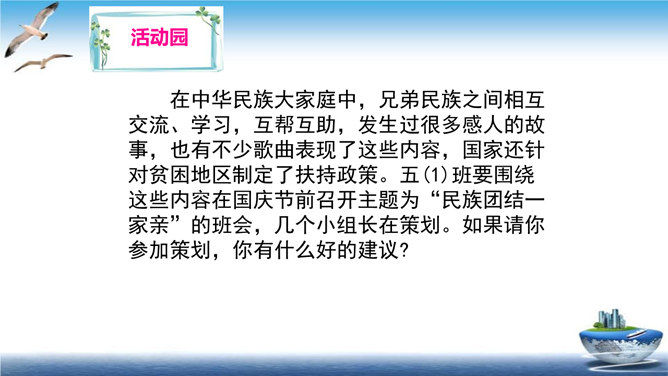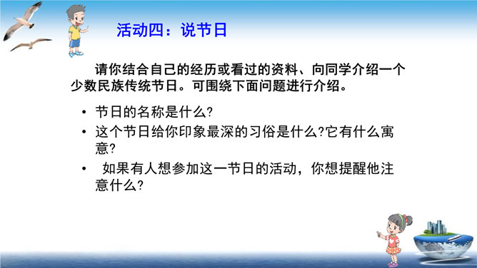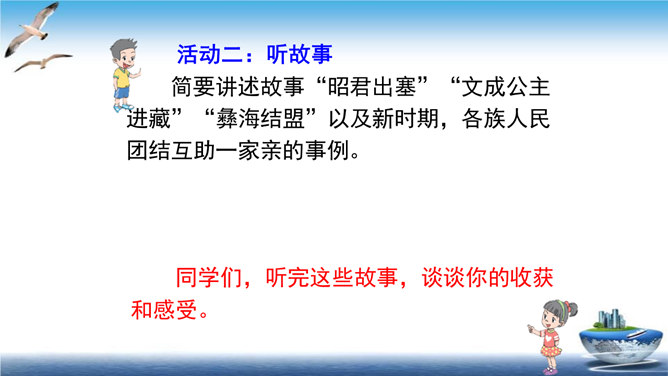 以小组为单位展示课前搜集的民族风俗习惯、特色服饰、语言文字等。简要讲述故事“昭君出塞”“文成公主进藏”“彝海结盟”以及新时期,各族人民团结互助一家亲的事例。请同学们讨论,在日常的学习生活中,如何与少数民族同学相处,或为维护民族团结能做哪些力所能及的事情?请你结合自己的经历或看过的资料、向同学介绍一个少数民族传统节日。可围绕下面问题进行介绍。节日的名称是什么?这个节日给你印象最深的习俗是什么?它有什么寓意?如果有人想参加这一节日的活动,你想提醒他注意什么?所属专题:中华民族一家亲ppt。