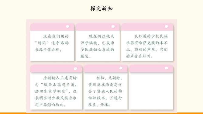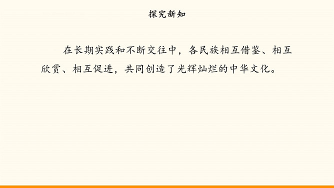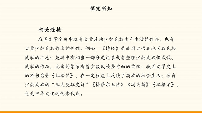 在长期实践和不断交往中,各民族相互借鉴、相互欣赏、相互促进,共同创造了光辉灿烂的中华文化。我国文学宝库中既有大量反映少数民族生产生活的作品,也有大量少数民族作者的创作。例如,《诗经》是我国古代各地区各民族民歌的汇总;楚辞中有相当一部分是记录或者整理少数民族仪式歌、民歌的作品,元曲的繁荣有着少数民族多方面的贡献;我国文学史上的不朽名著《红楼梦》,在一定程度上反映了满族的社会生活;源自少数民族的“三大英雄史诗”《格萨尔王传》《玛纳斯》《江格尔》,也是中华文化的优秀代表。所属专题:中华民族一家亲ppt。