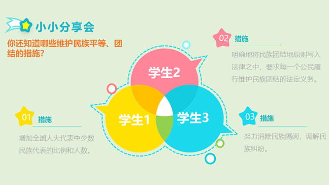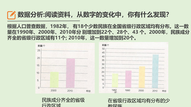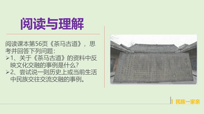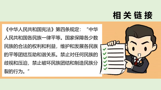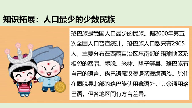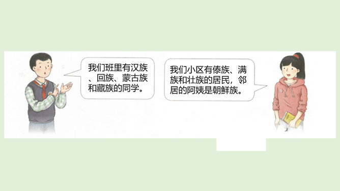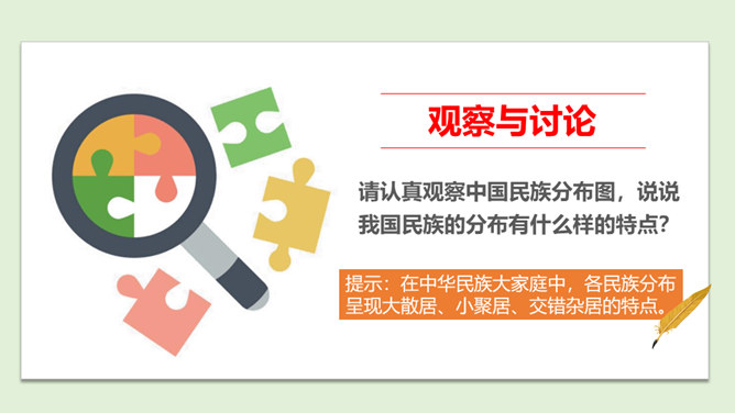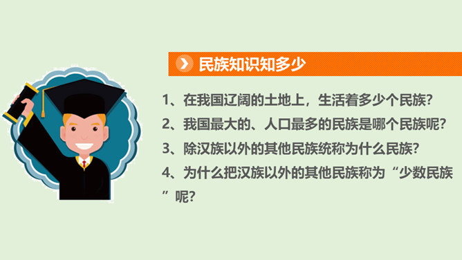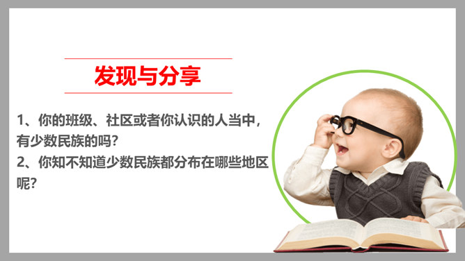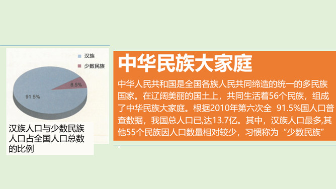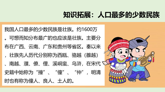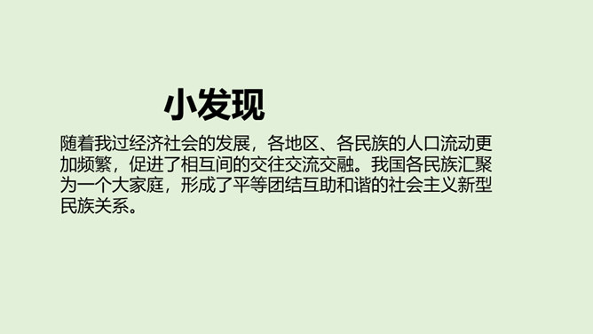1、在我国辽阔的土地上,生活着多少个民族?2、我国最大的、人口最多的民族是哪个民族呢?3、除汉族以外的其他民族统称为什么民族?4、为什么把汉族以外的其他民族称为“少数民族”呢?在这样的大散居、小聚居、交错杂居的情况之下,各民族之间会出现怎样的一种情况呢?随着我过经济社会的发展,各地区、各民族的人口流动更加频繁,促进了相互间的交往交流交融。我国各民族汇聚为一个大家庭,形成了平等团结互助和谐的社会主义新型民族关系。历史上,江南地区的开发是汉族和少数民族共同努力奋斗的结果。所属专题:中华民族一家亲ppt。