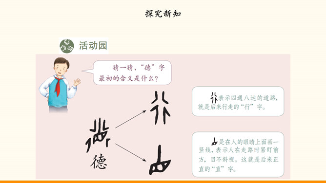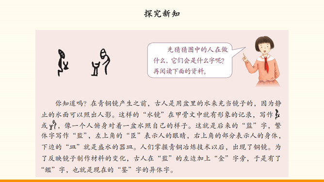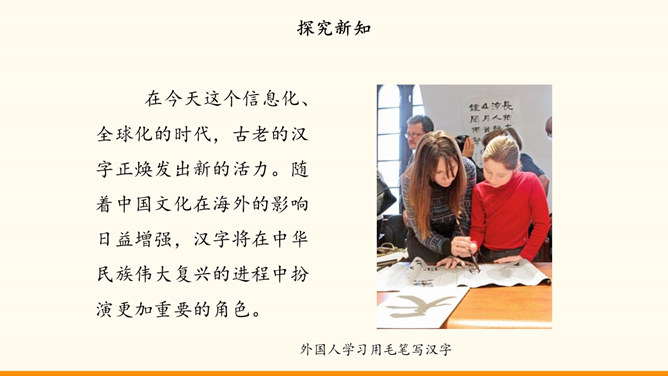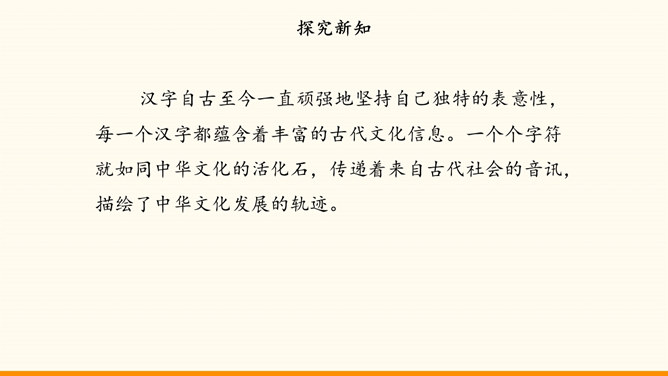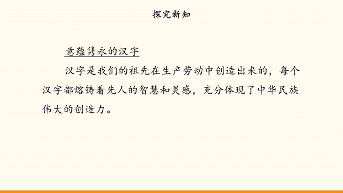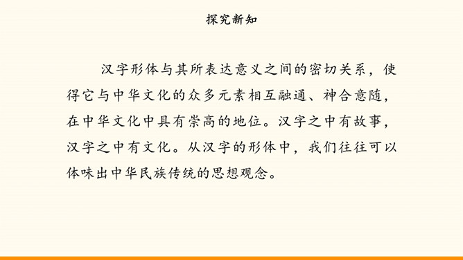 汉字是我们的祖先在生产劳动中创造出来的,每个汉字都熔铸着先人的智慧和灵感,充分体现了中华民族伟大的创造力。 汉字形体与其所表达意义之间的密切关系,使得它与中华文化的众多元素相互融通、神合意随,在中华文化中具有崇高的地位。汉字之中有故事,汉字之中有文化。从汉字的形体中,我们往往可以体味出中华民族传统的思想观念。汉字自古至今一直顽强地坚持自己独特的表意性,每一个汉字都蕴含着丰富的古代文化信息。一个个字符就如同中华文化的活化石,传递着来自古代社会的音讯,描绘了中华文化发展的轨迹。所属专题:美丽文字民族瑰宝ppt。