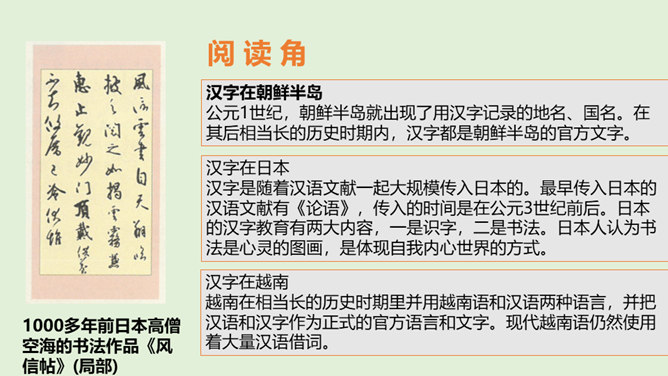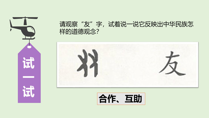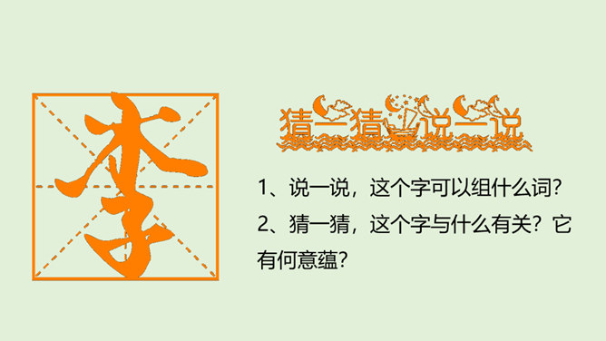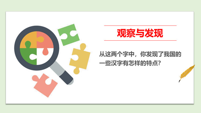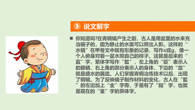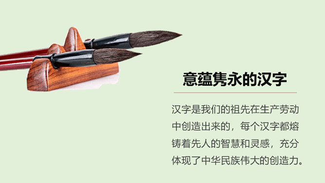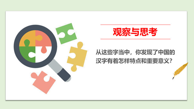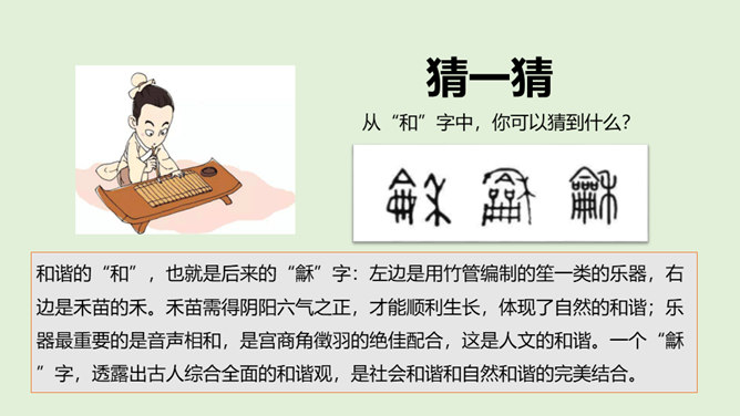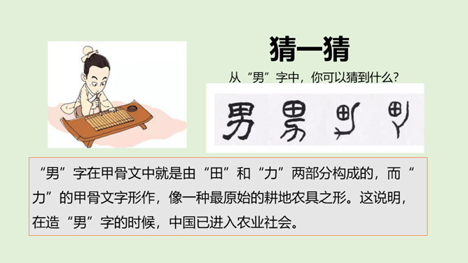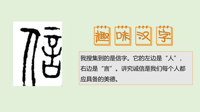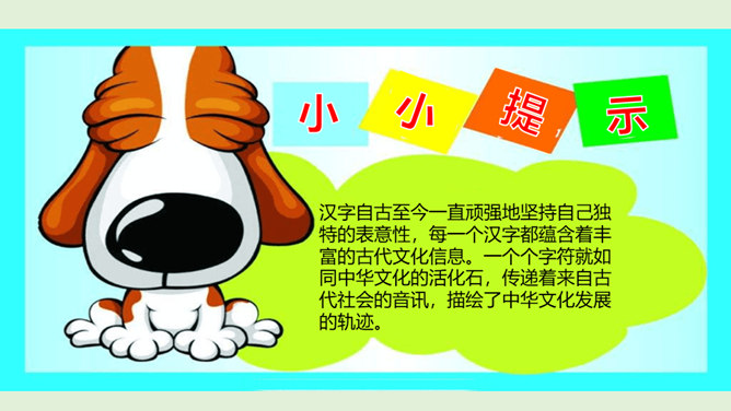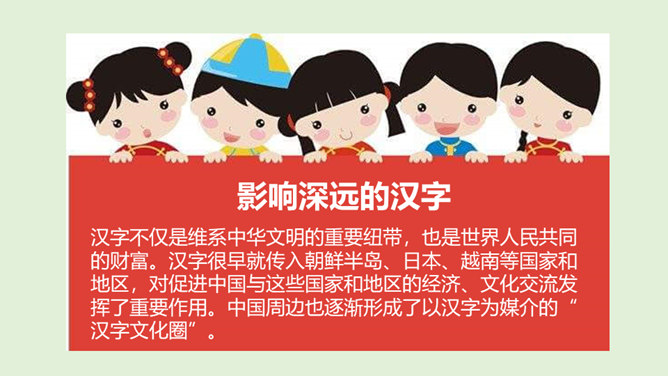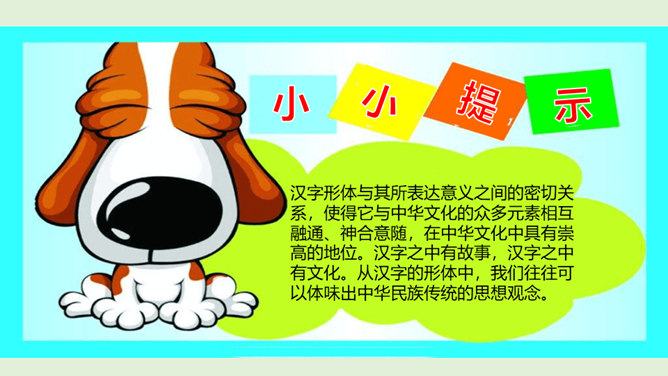 汉字形体与其所表达意义之间的密切关系,使得它与中华文化的众多元素相互融通、神合意随,在中华文化中具有崇高的地位。汉字之中有故事,汉字之中有文化。从汉字的形体中,我们往往可以体味出中华民族传统的思想观念。汉字是我们的祖先在生产劳动中创造出来的,每个汉字都熔铸着先人的智慧和灵感,充分体现了中华民族伟大的创造力。从这些字当中,你发现了中国的汉字有着怎样特点和重要意义?汉字自古至今一直顽强地坚持自己独特的表意性,每一个汉字都蕴含着丰富的古代文化信息。所属专题:美丽文字民族瑰宝ppt。