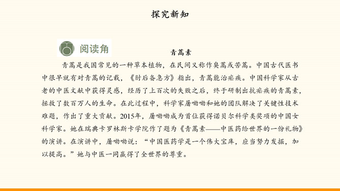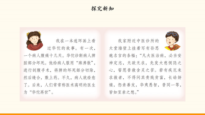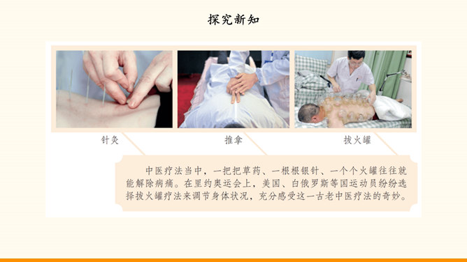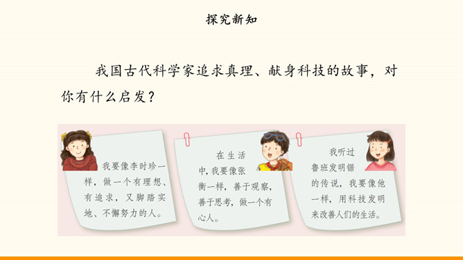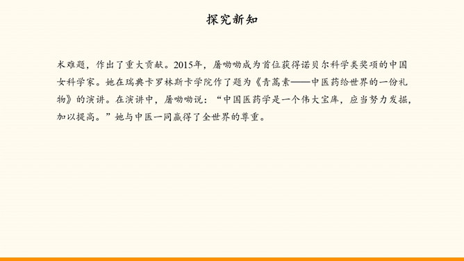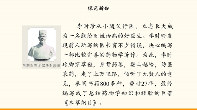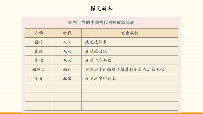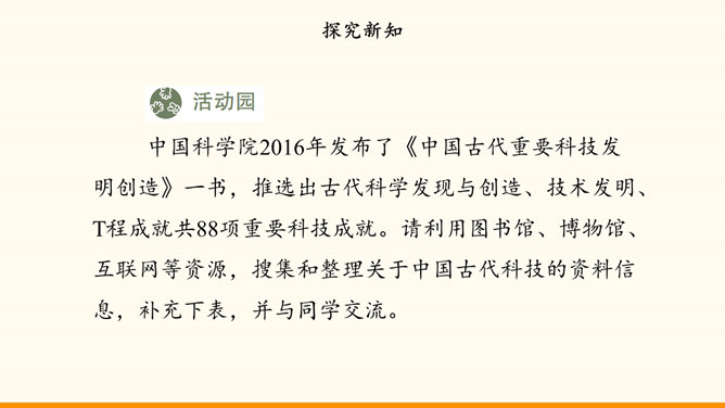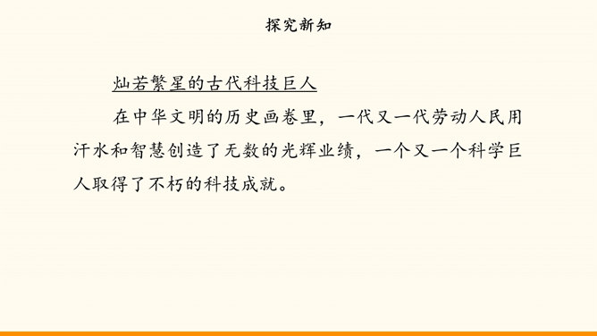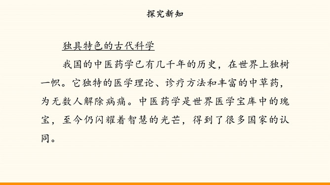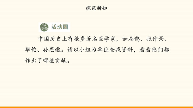 在中华文明的历史画卷里,一代又一代劳动人民用汗水和智慧创造了无数的光辉业绩,一个又一个科学巨人取得了不朽的科技成就。我国的中医药学已有几千年的历史,在世界上独树一帜。它独特的医学理论、诊疗方法和丰富的中草药,为无数人解除病痛。中医药学是世界医学宝库中的瑰宝,至今仍闪耀着智慧的光芒,得到了很多国家的认同。中国历史上有很多著名医学家,如扁鹊、张仲景、华佗、孙思邈。请以小组为单位查找资料,看看他们都作出了哪些贡献。中国古代十分重视数学研究及其运用,并取得了巨大成就。所属专题:古代科技耀我中华ppt。