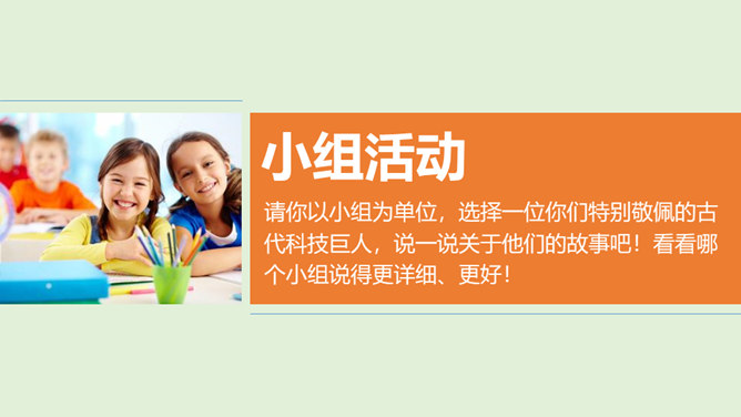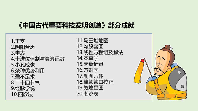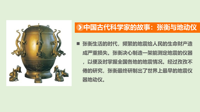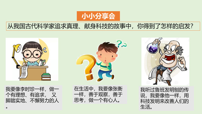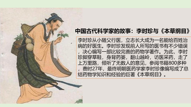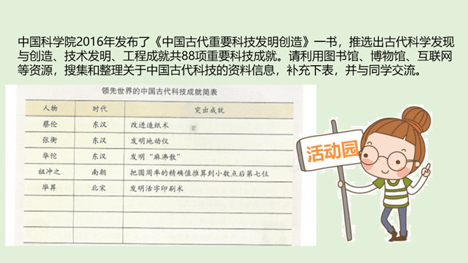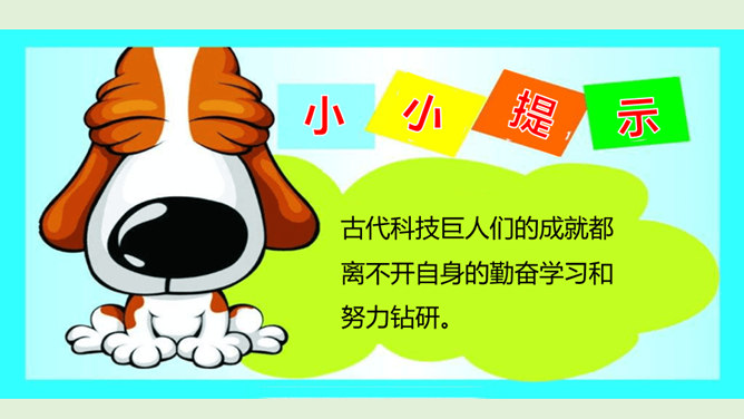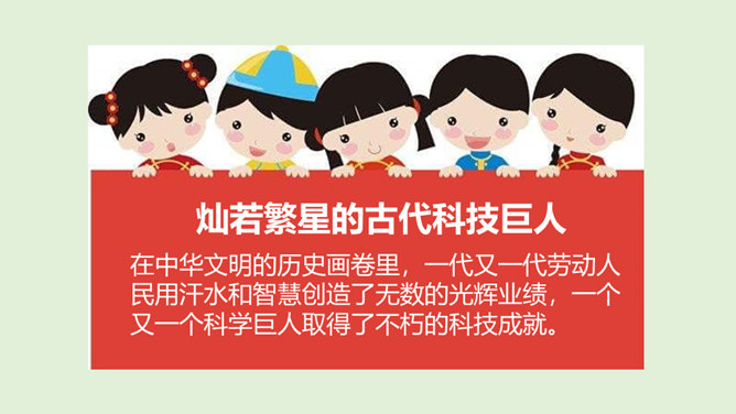 在中华文明的历史画卷里,一代又一代劳动人民用汗水和智慧创造了无数的光辉业绩,一个又一个科学巨人取得了不朽的科技成就。请你以小组为单位,选择一位你们特别敬佩的古代科技巨人,说一说关于他们的故事吧!看看哪个小组说得更详细、更好!除了我国的中医药学以外,我们的祖先们在长期的农业生产活动中,还总结出丰富的农业生产经验,在与农业密切相关的天文历法方面,也取得辉煌成就。这些靠劳动人民聪明才智获得的科学知识和生产技术,在世界上长期处于领先地位。所属专题:古代科技耀我中华ppt。