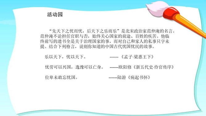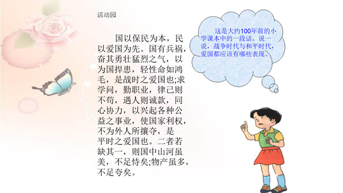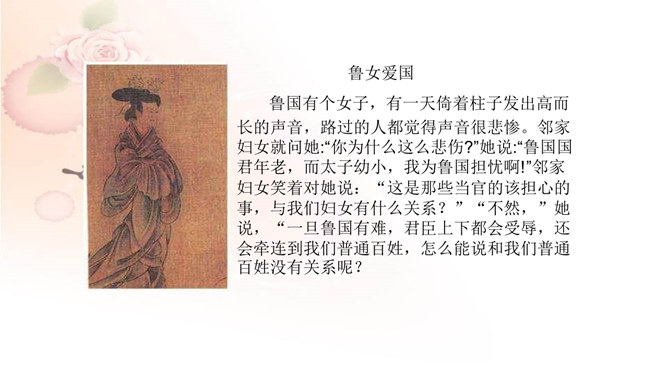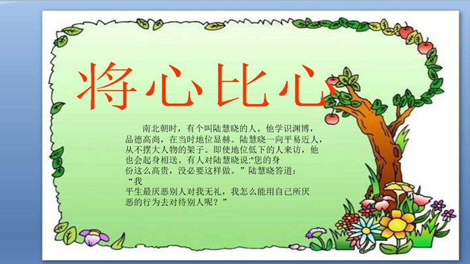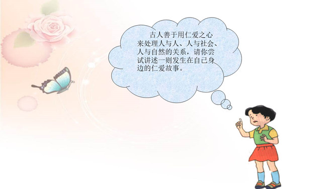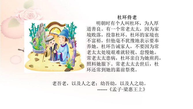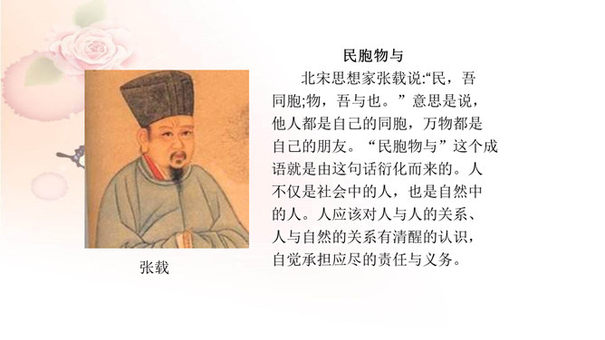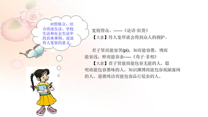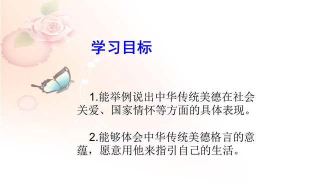 1.能举例说出中华传统美德在社会关爱、国家情怀等方面的具体表现。2.能够体会中华传统美德格言的意蕴,愿意用他来指引自己的生活。对照格言,结合班级生活、学校生活和社会生活中的具体事例、说说待人宽容的意义。古人善于用仁爱之心来处理人与人、人与社会、人与自然的关系,请你尝试讲述一则发生在自已身边的仁爱故事。源远流长的中华传统美德是强大的文化基因,深深影响着中国人的精神气质。在实现中华民族伟大复兴的事业中,传统美德永远是我们不断奋进的精神动力。所属专题:传统美德源远流长ppt。