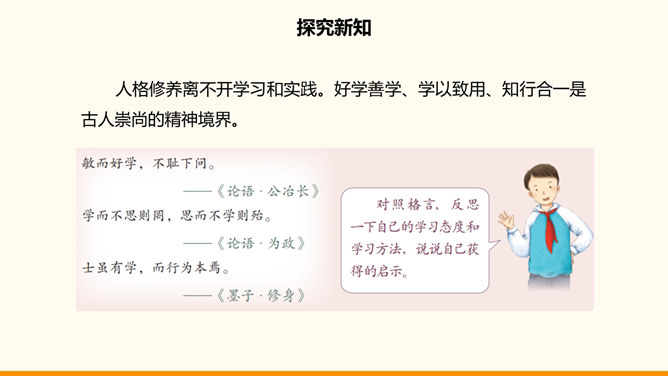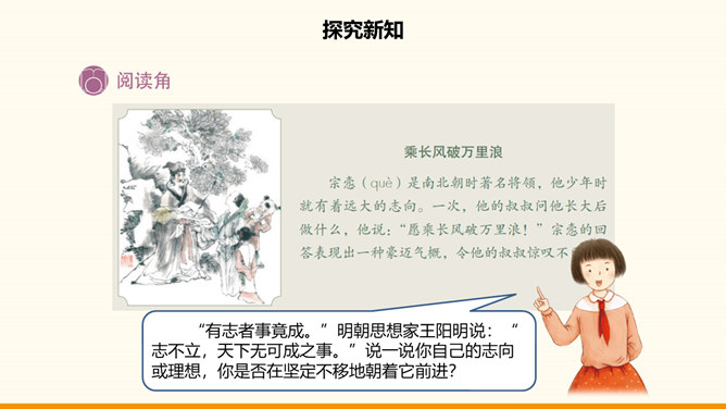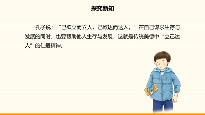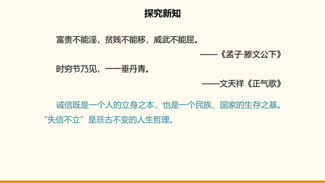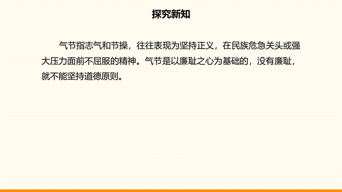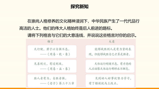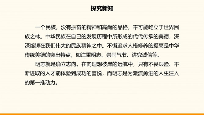 一个民族,没有振奋的精神和高尚的品格,不可能屹立于世界民族之林。中华民族在自己的发展历程中所形成的代代传承的美德,深深熔铸在我们伟大的民族精神之中。不懈追求人格修养的提高是中华传统美德的突出特点,如注重明志、崇尚气节、讲究诚信等。明志就是确立志向。在向理想彼岸的远航中,只有不畏艰险、不断进取的人才能体验到成功的喜悦,而明志是为激流勇进的人生注入的第一推动力。气节指志气和节操,往往表现为坚持正义,在民族危急关头或强大压力面前不屈服的精神。所属专题:传统美德源远流长ppt。