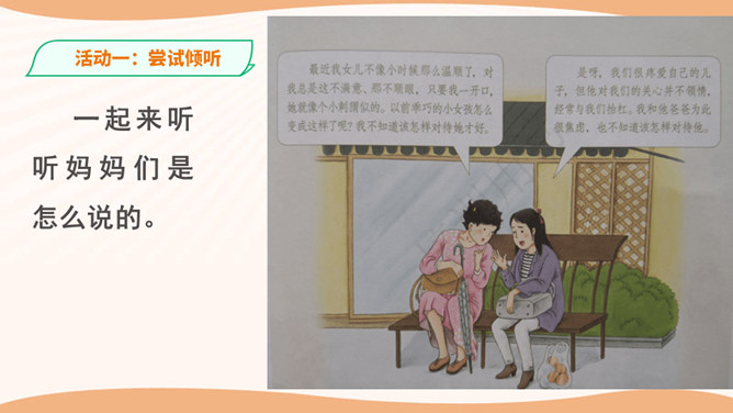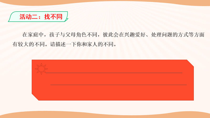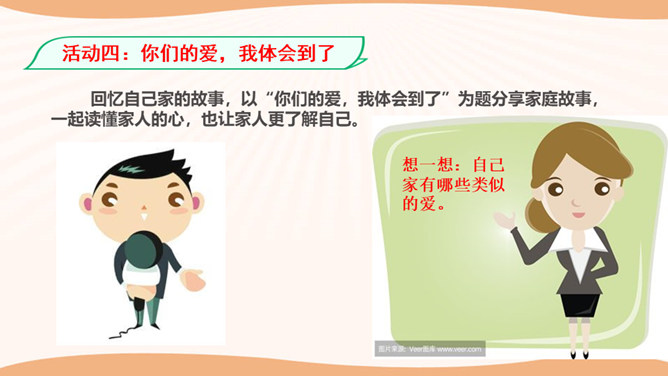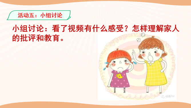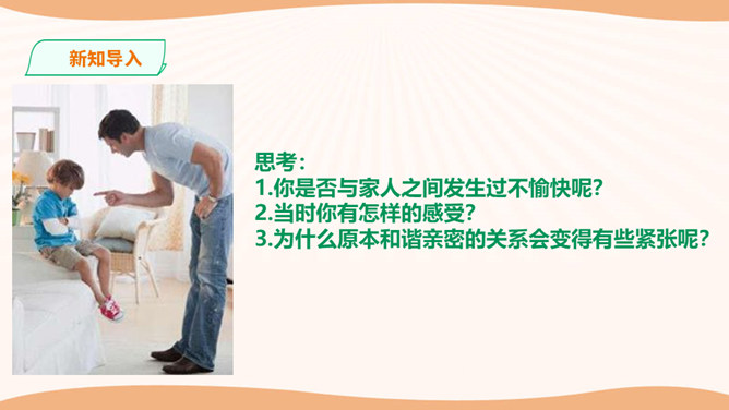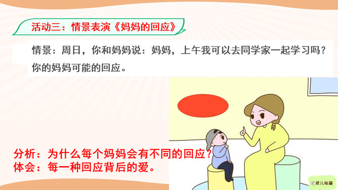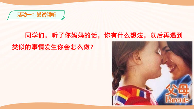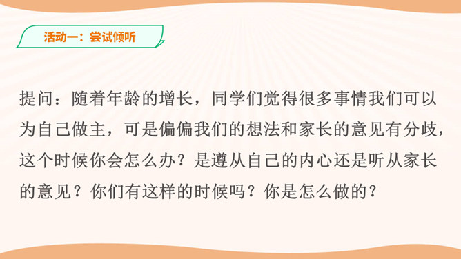 思考:1.你是否与家人之间发生过不愉快呢?2.当时你有怎样的感受?3.为什么原本和谐亲密的关系会变得有些紧张呢?提问:随着年龄的增长,同学们觉得很多事情我们可以为自己做主,可是偏偏我们的想法和家长的意见有分歧,这个时候你会怎么办?是遵从自己的内心还是听从家长的意见?你们有这样的时候吗?你是怎么做的?一起来听听妈妈们是怎么说的。同学们,听了你妈妈的话,你有什么想法,以后再遇到类似的事情发生你会怎么做?在家庭中,孩子与父母角色不同,彼此会在兴趣爱好、处理问题的方式等方面有较大的不同。所属专题:读懂彼此的心ppt。