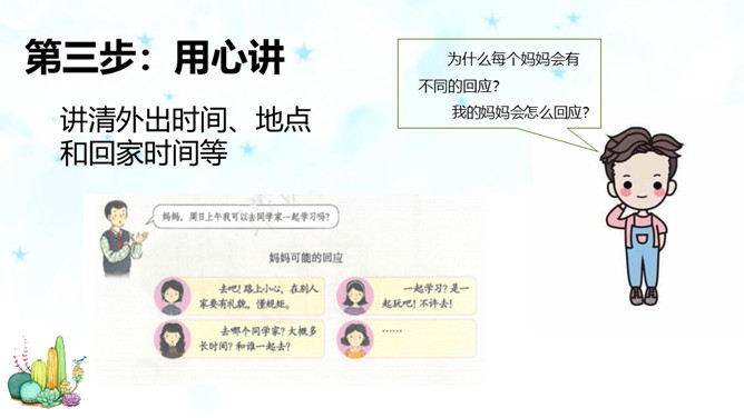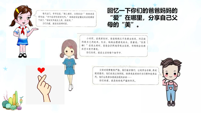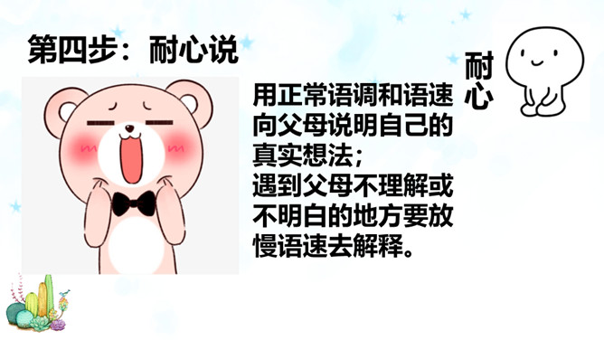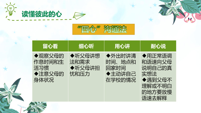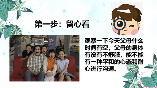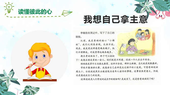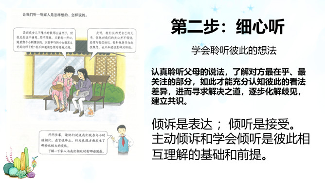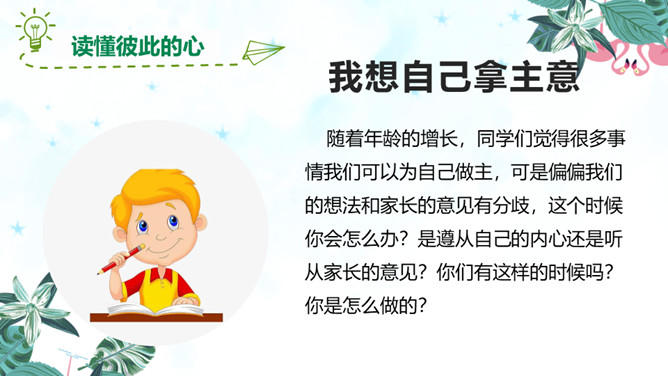 随着年龄的增长,同学们觉得很多事情我们可以为自己做主,可是偏偏我们的想法和家长的意见有分歧,这个时候你会怎么办?是遵从自己的内心还是听从家长的意见?你们有这样的时候吗?你是怎么做的?观察一下今天父母什么时间有空,父母的身体有没有不舒服,能不能有一种平和的心态和耐心进行沟通。认真聆听父母的说法,了解对方最在乎、最关注的部分,如此才能充分认知彼此的看法差异,进而寻求解决之道,逐步化解歧见,建立共识。倾诉是表达 ;倾听是接受。主动倾诉和学会倾听是彼此相互理解的基础和前提。所属专题:读懂彼此的心ppt。
