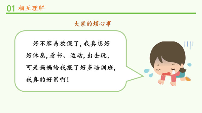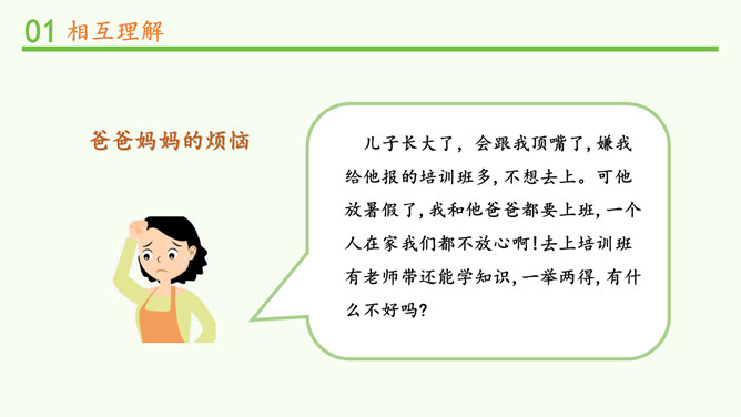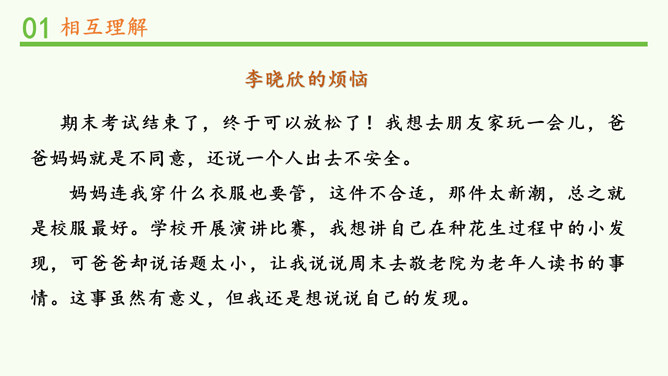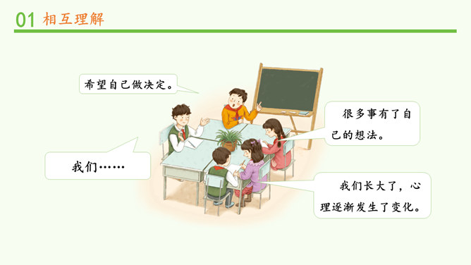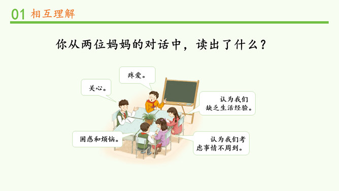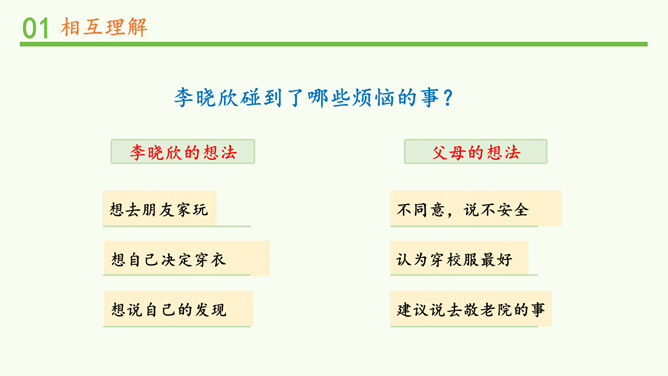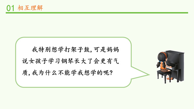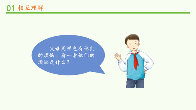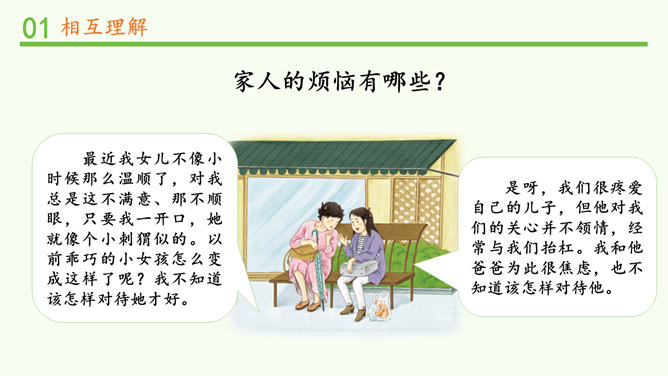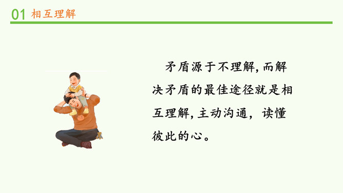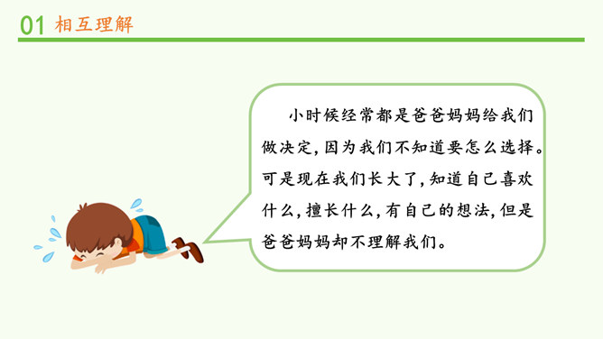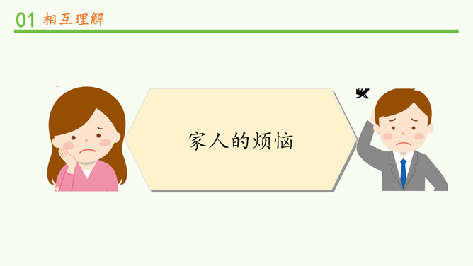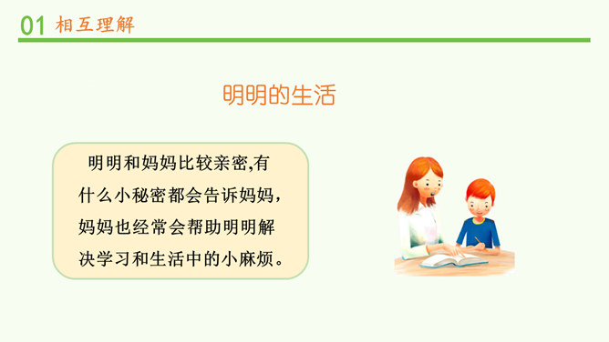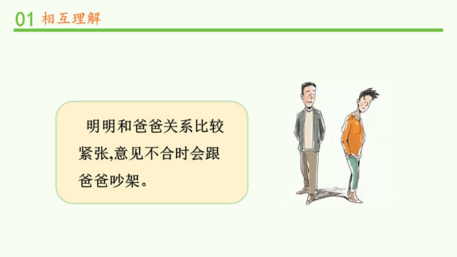 明明和妈妈比较亲密,有什么小秘密都会告诉妈妈,妈妈也经常会帮助明明解决学习和生活中的小麻烦。明明和爸爸关系比较紧张,意见不合时会跟爸爸吵架。矛盾源于不理解,而解决矛盾的最佳途径就是相互理解,主动沟通,读懂彼此的心。爸爸妈妈的人生经历、生活经验相对丰富,他们对生活的态度,思考问题的角度等方面与我们不同自然是很正常的。所以,当我们和家人之间想法不一样时,要换位思考,想一想他们为什么会这么说,就更容易理解长辈们的想法,接纳他们不同的意见和建议。所属专题:读懂彼此的心ppt。