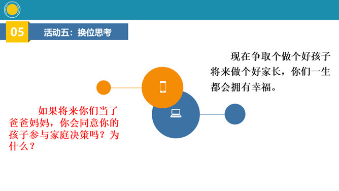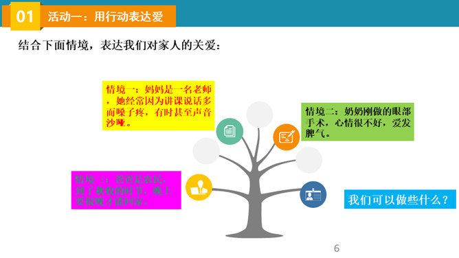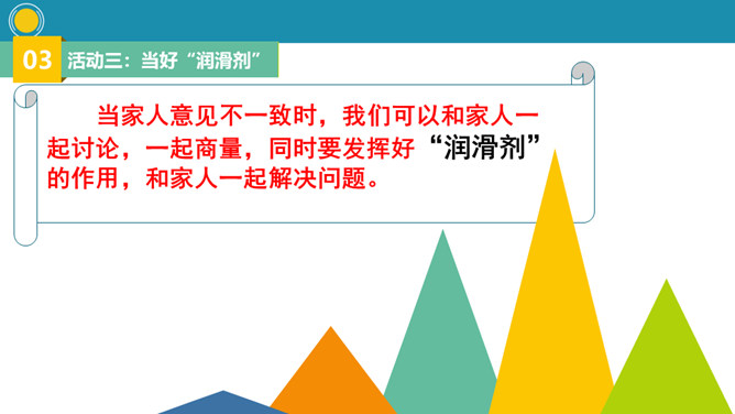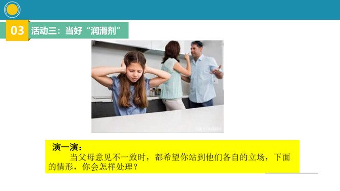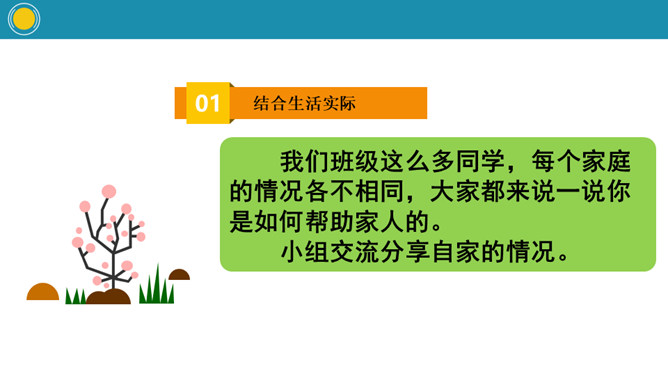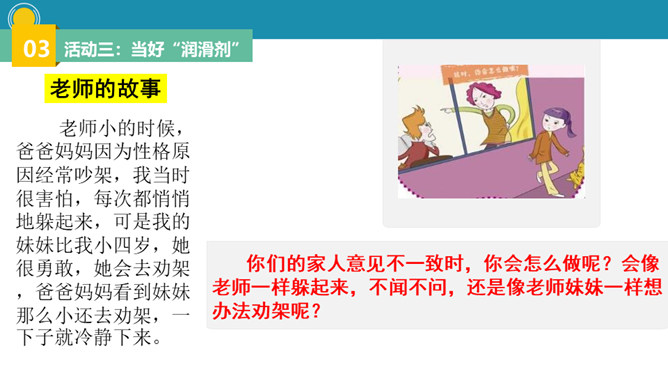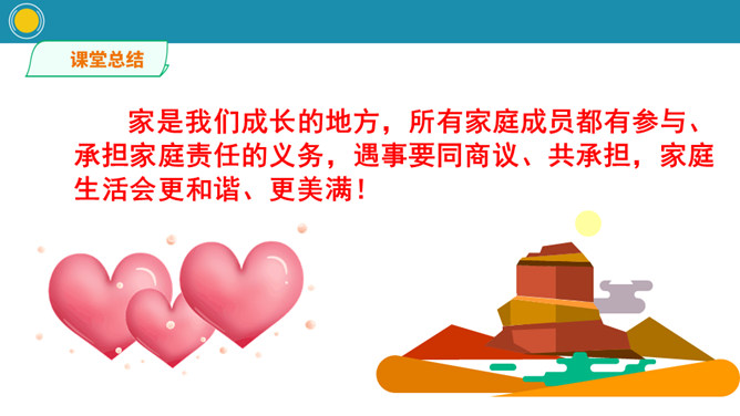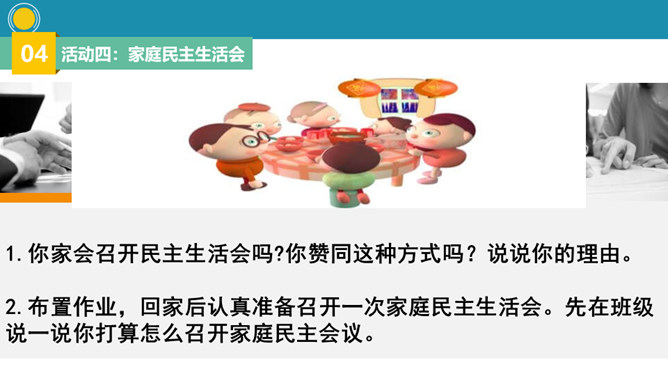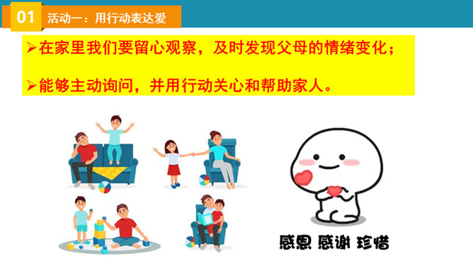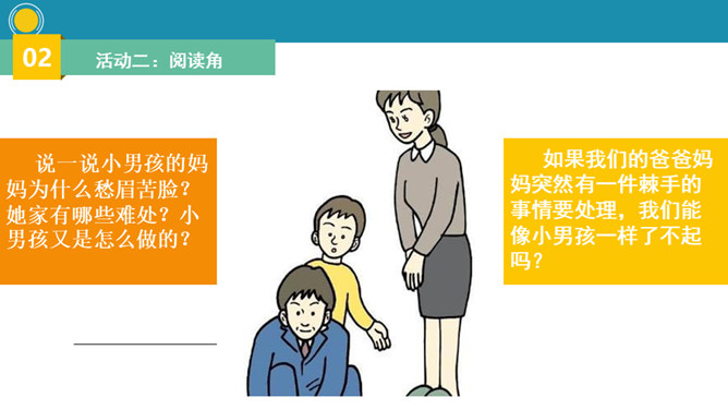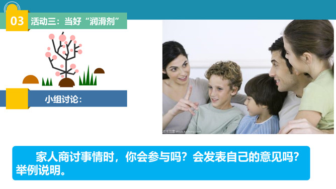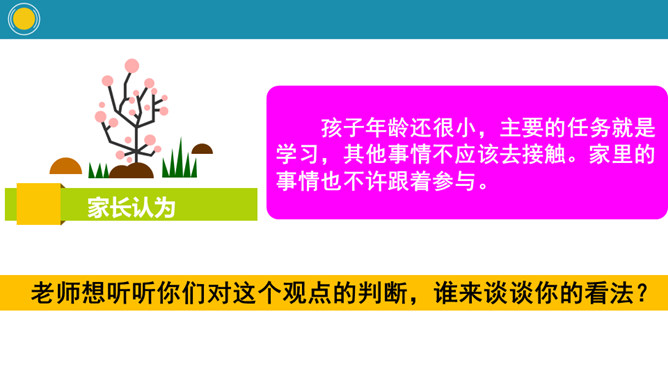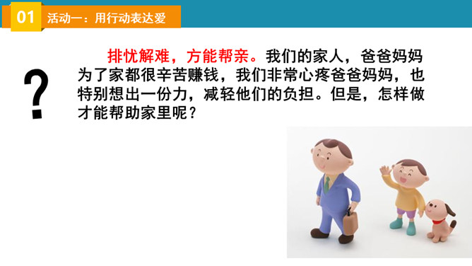 孩子年龄还很小,主要的任务就是学习,其他事情不应该去接触。家里的事情也不许跟着参与。老师想听听你们对这个观点的判断,谁来谈谈你的看法?排忧解难,方能帮亲。我们的家人,爸爸妈妈为了家都很辛苦赚钱,我们非常心疼爸爸妈妈,也特别想出一份力,减轻他们的负担。但是,怎样做才能帮助家里呢?在家里我们要留心观察,及时发现父母的情绪变化;能够主动询问,并用行动关心和帮助家人。我们班级这么多同学,每个家庭的情况各不相同,大家都来说一说你是如何帮助家人的。所属专题:让我们的家更美好ppt。