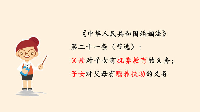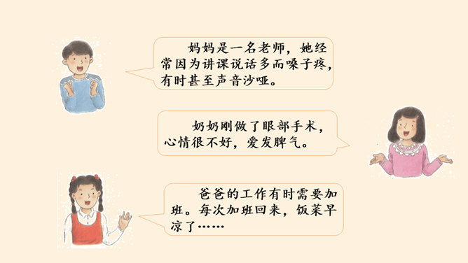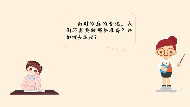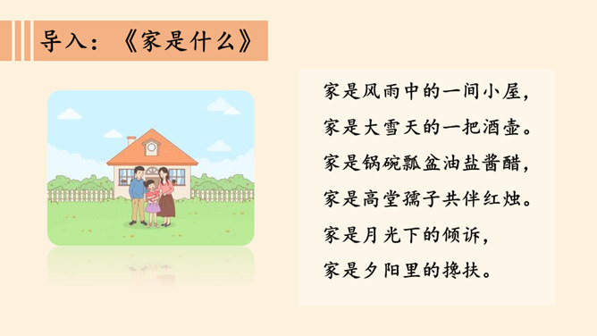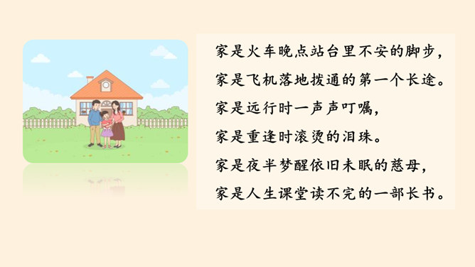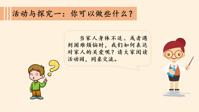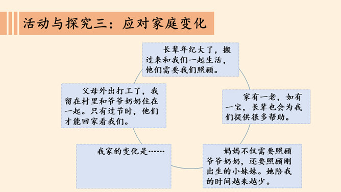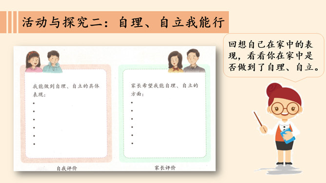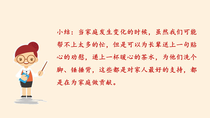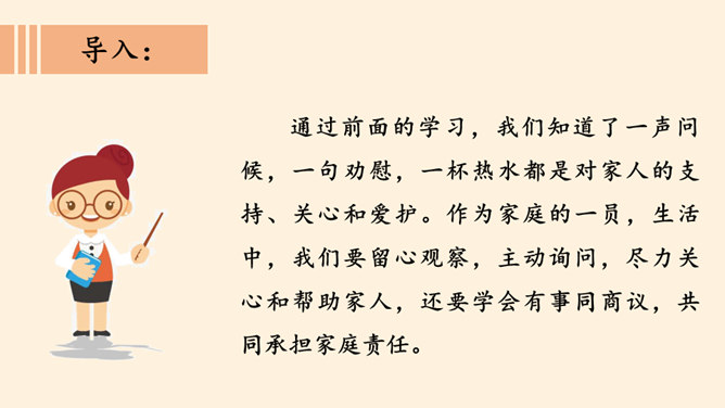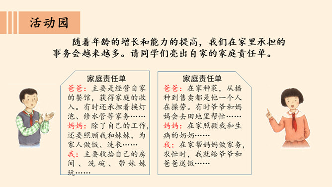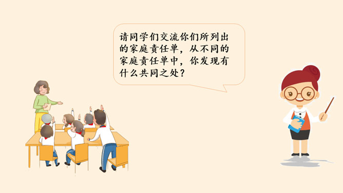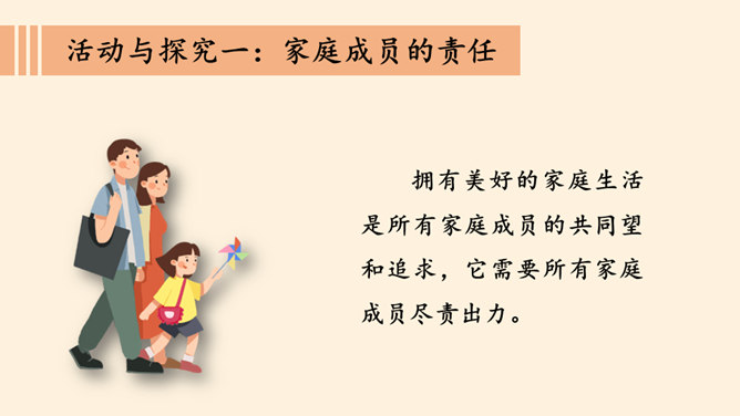 拥有美好的家庭生活是所有家庭成员的共同望和追求,它需要所有家庭成员尽责出力。说一说:家庭需要承担的责任有哪些?家庭为我们提供了什么,对我们而言有什么意义?随着年龄的增长和能力的提高,我们在家里承担的事务会越来越多。请同学们亮出自家的家庭责任单。请同学们交流你们所列出的家庭责任单,从不同的家庭责任单中,你发现有什么共同之处?回想自己在家中的表现,看看你在家中是否做到了自理、自立。通过比较,你获得了哪些启示?想想今后还可在哪些方面有提高。所属专题:让我们的家更美好ppt。