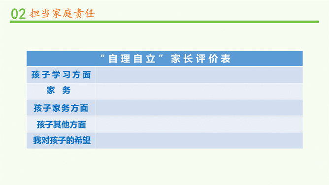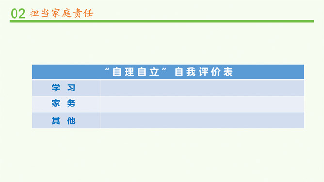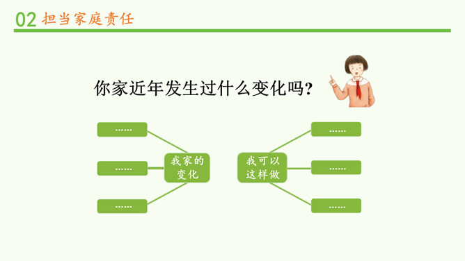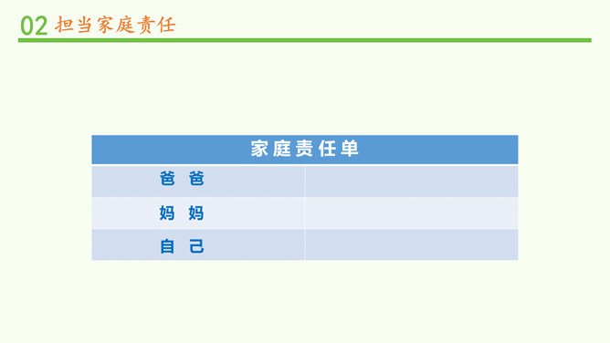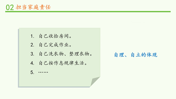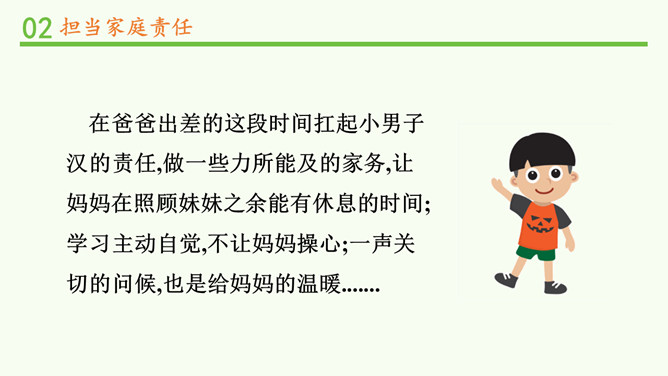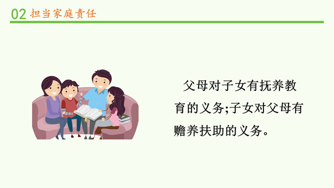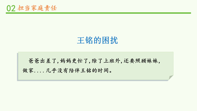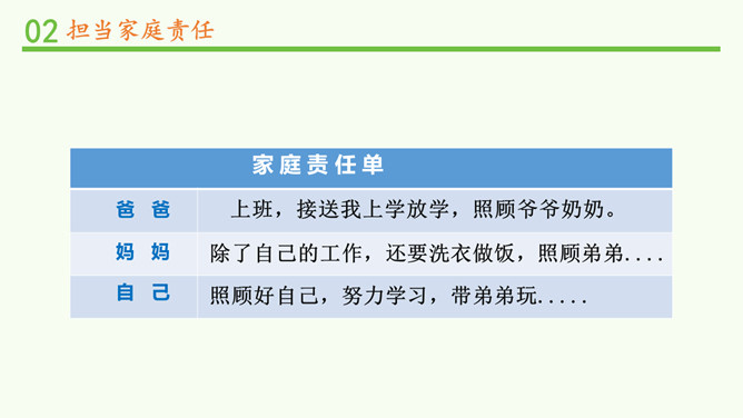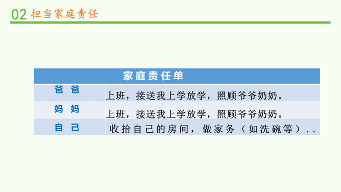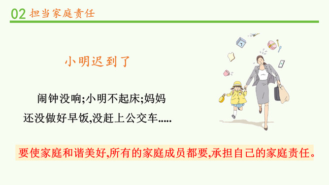 闹钟没响,小明不起床,妈妈还没做好早饭,没赶上公交车.....要使家庭和谐美好,所有的家庭成员都要,承担自己的家庭责任。 自己收拾房间。自己完成作业。自己洗衣物、整理衣物。自己按作息规律生活。父母对子女有抚养教育的义务;子女对父母有赡养扶助的义务。作为子女,自理、自立是我们在家庭生活中担当的责任之一。除此之外,家庭发生变化时,我们也应该有所担当。在爸爸出差的这段时间扛起小男子汉的责任,做一些力所能及的家务,让妈妈在照顾妹妹之余能有休息的时间;学习主动自觉,不让妈妈操心。所属专题:让我们的家更美好ppt。