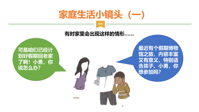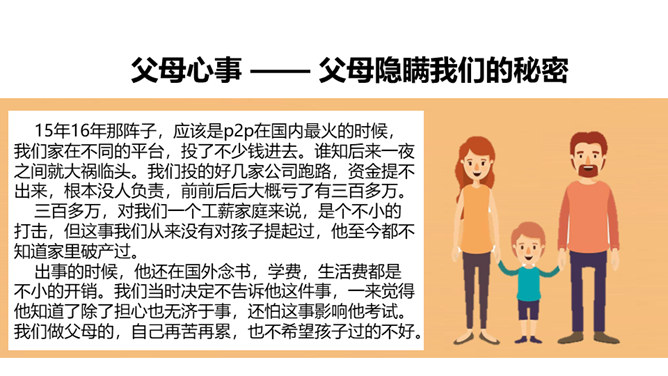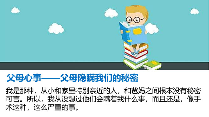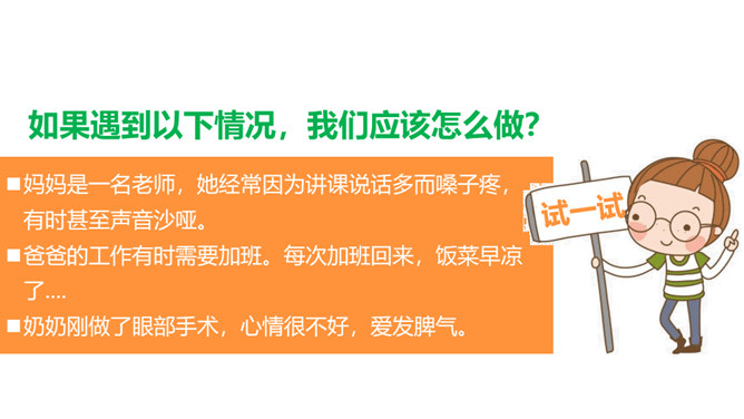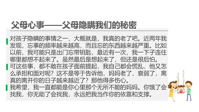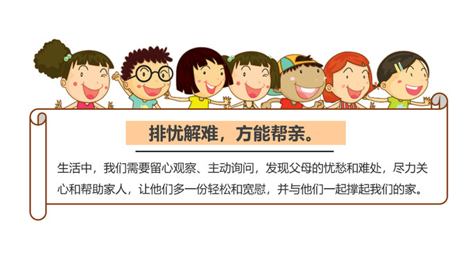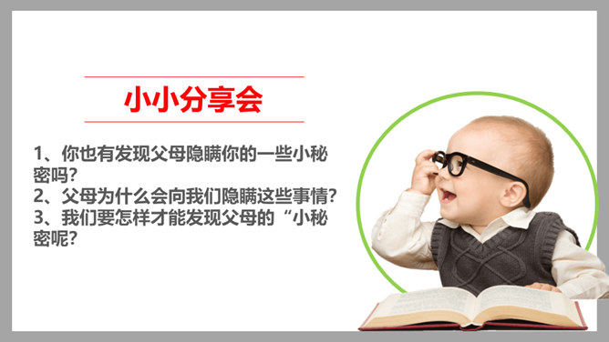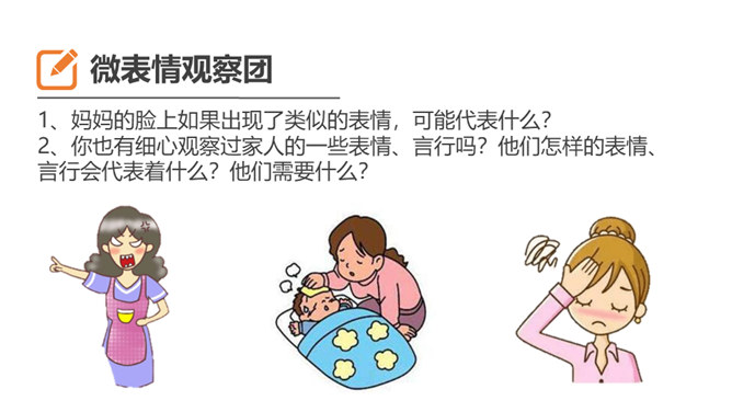 1、你也有发现父母隐瞒你的一些小秘密吗?2、父母为什么会向我们隐瞒这些事情?3、我们要怎样才能发现父母的“小秘密呢?生活中,我们需要留心观察、主动询问,发现父母的忧愁和难处,尽力关心和帮助家人,让他们多一份轻松和宽慰,并与他们一起撑起我们的家。1、妈妈的脸上如果出现了类似的表情,可能代表什么?2、你也有细心观察过家人的一些表情、言行吗?他们怎样的表情、言行会代表着什么?他们需要什么?生活中,我们需要留心观察、主动询问,发现父母的忧愁和难处,尽力关心和帮助家人,并与他们一起撑起我们的家。所属专题:让我们的家更美好ppt。