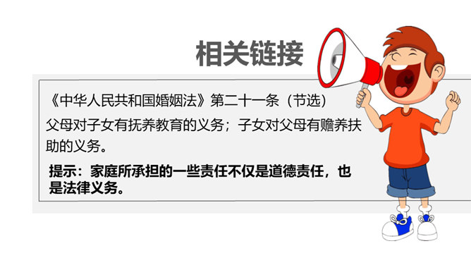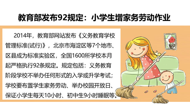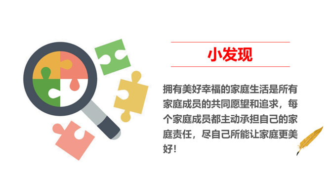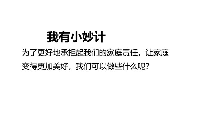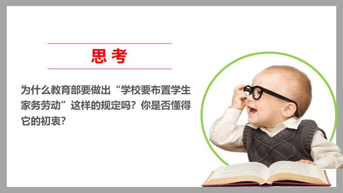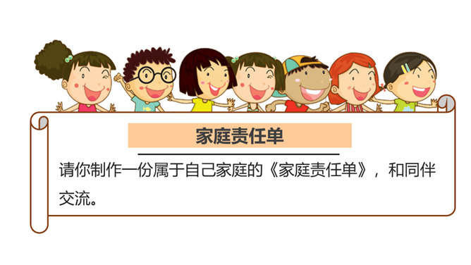 为什么教育部要做出“学校要布置学生家务劳动”这样的规定吗?你是否懂得它的初衷?家是我们身心的寄居之所,是我们心灵的港湾。每位家庭成员都享受着家庭带来的物质条件和精神慰藉,同样的,每位家庭成员也应该当担起自己的家庭责任。而随着年龄的增长和能力的提高,我们在家里承担的事物也会越来越多。拥有美好幸福的家庭生活是所有家庭成员的共同愿望和追求,每个家庭成员都主动承担自己的家庭责任,尽自己所能让家庭更美好!家对于你而言,有怎样重要的意义呢?所属专题:让我们的家更美好ppt。