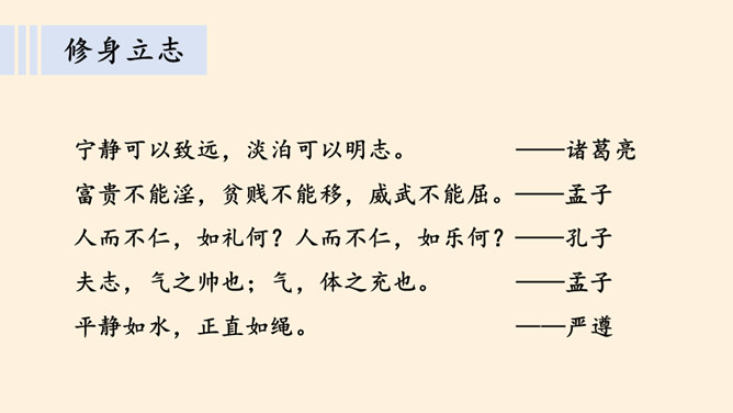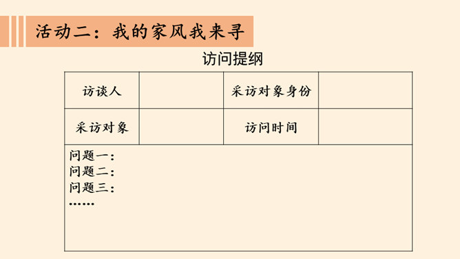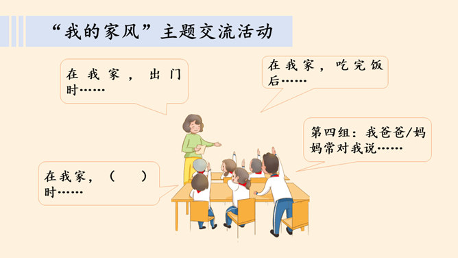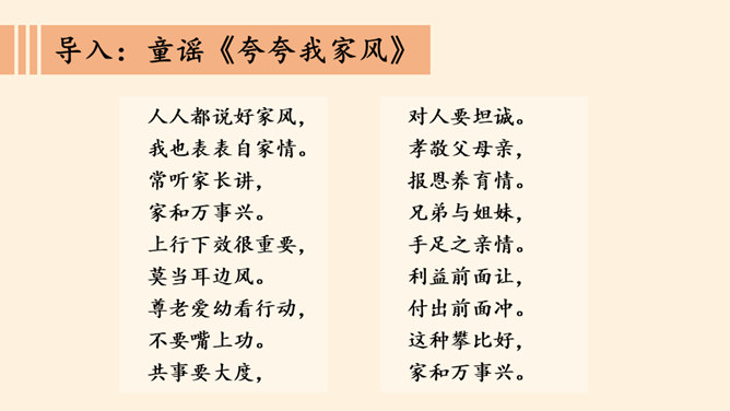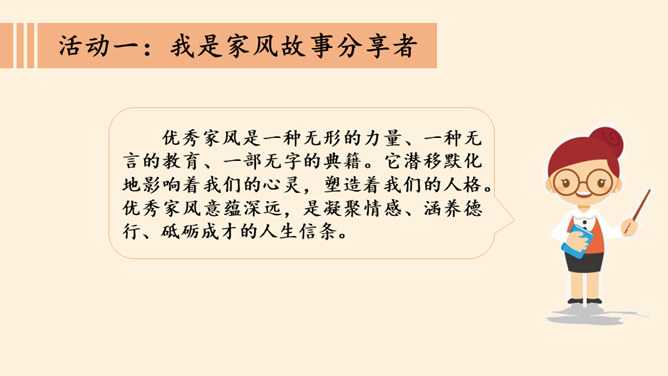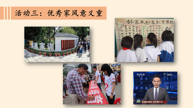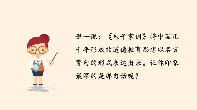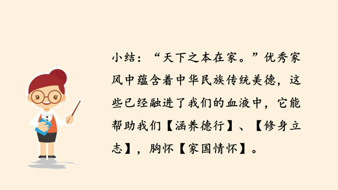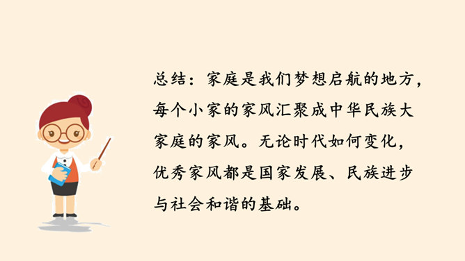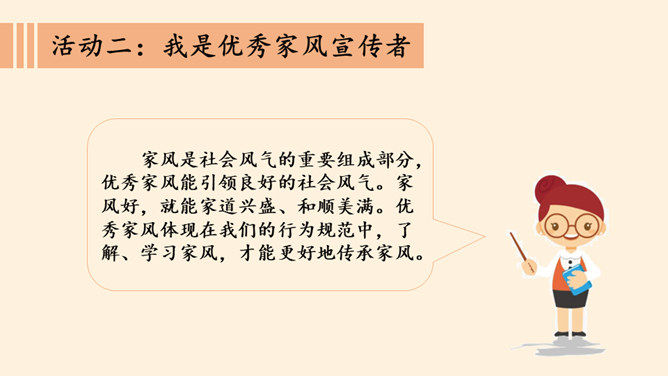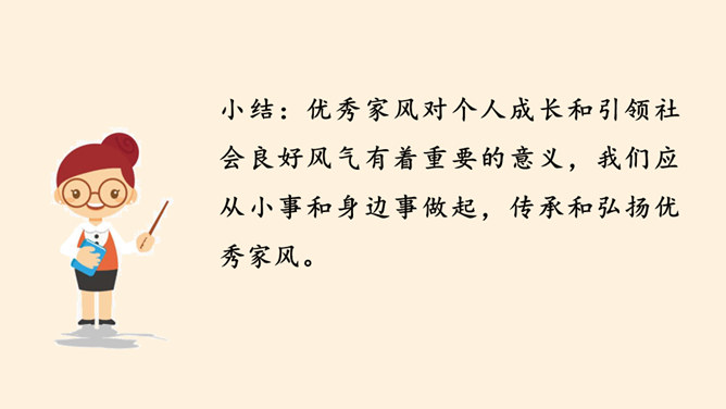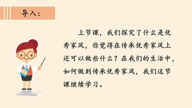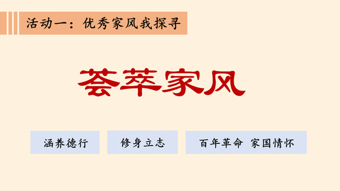说一说:《朱子家训》将中国几千年形成的道德教育思想以名言警句的形式表达出来。让你印象最深的是那句话呢?总结:家庭是我们梦想启航的地方,每个小家的家风汇聚成中华民族大家庭的家风。无论时代如何变化,优秀家风都是国家发展、民族进步与社会和谐的基础。我们探究了什么是优秀家风,你觉得在传承优秀家风上还可以做些什么?在我们的生活中,如何做到传承优秀家风,我们这节课继续学习。优秀家风是一种无形的力量、一种无言的教育、一部无字的典籍。它潜移默化地影响着我们的心灵,塑造着我们的人格。所属专题:弘扬优秀家风ppt。