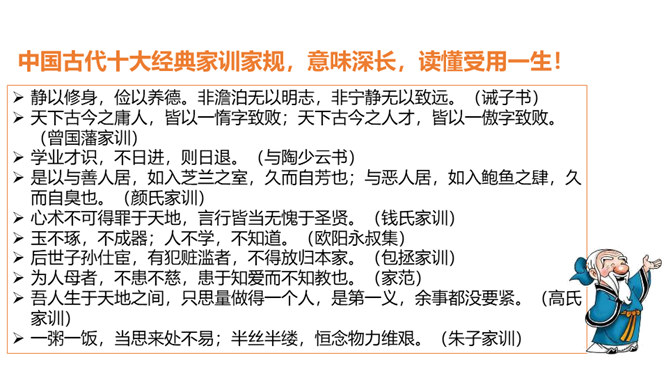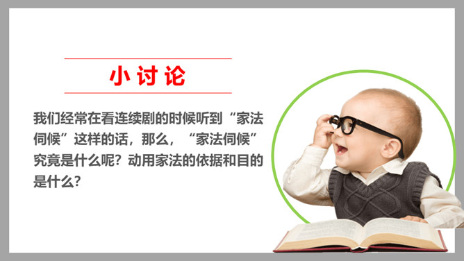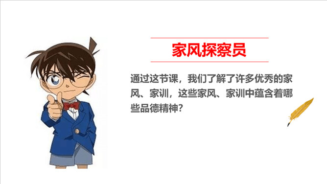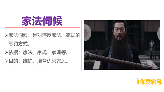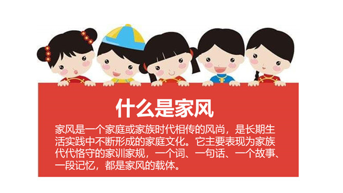 我们经常在看连续剧的时候听到“家法伺候”这样的话,那么,“家法伺候”究竟是什么呢?家风是一个家庭或家族时代相传的风尚,是长期生活实践中不断形成的家庭文化。它主要表现为家族代代恪守的家训家规,一个词、一句话、一个故事、一段记忆,都是家风的载体。我国古代有极为丰富的家训家规,其中很多被广为传播,对后人的思想和生活产生了广泛的影响。在培育良好家风方面,先辈们为我们作出了榜样。不同的时代,为国家、为民族不计得失的精神,牺牲个人、献身革命的家国情怀,铸就了我们伟大的民族之魂。所属专题:弘扬优秀家风ppt。