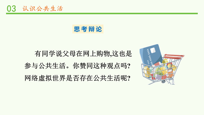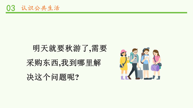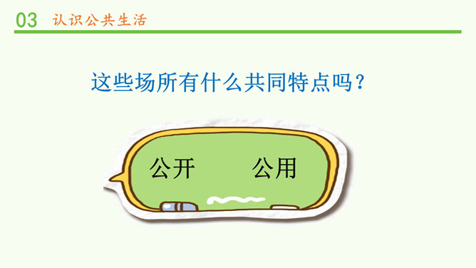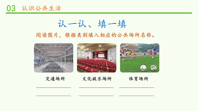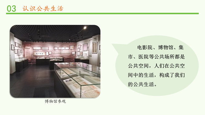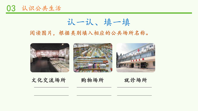 这些场所有什么共同特点吗?阅读图片,根据类别填入相应的公共场所名称。电影院、博物馆、集市、医院等公共场所都是公共空间,人们在公共空间中的生活,构成了我们的公共生活。明天就要秋游了,需要采购东西,我到哪里解决这个问题呢?夜里,突然发了高烧,应该怎么办呢? 想知道关于家乡更多的历史,有什么办法呢?我们生活中的购物、就医、娱乐等活动都要在公共场所进行。有同学说父母在网上购物,这也是参与公共生活。你赞同这种观点吗?网络虛拟世界是否存在公共生活呢?所属专题:我们的公共生活ppt。