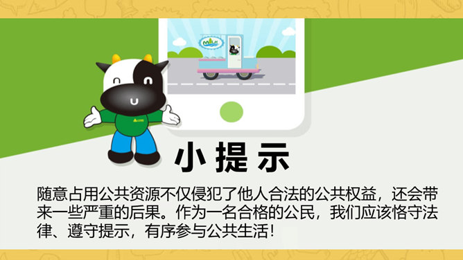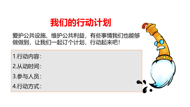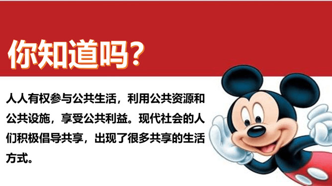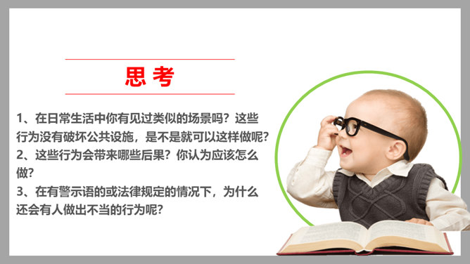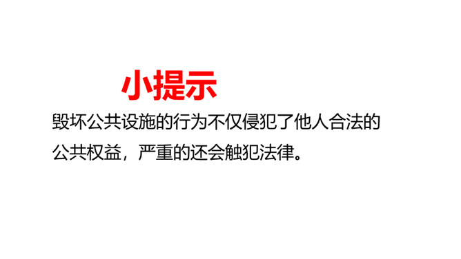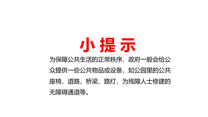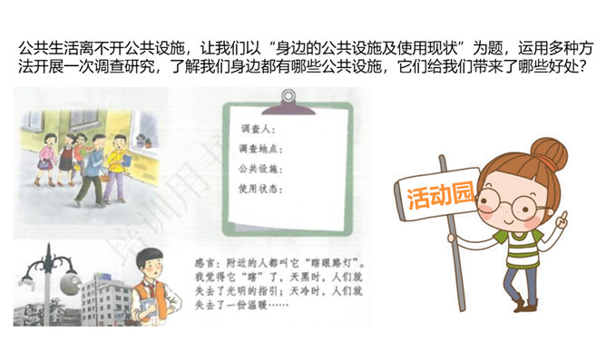 保障公共生活的正常秩序,政府一般会给公众提供一些公共物品或设备,如公园里的公共座椅,道路、桥梁、路灯,为残障人士修建的无障碍通道等。公共生活离不开公共设施,让我们以“身边的公共设施及使用现状”为题,运用多种方法开展一次调查研究,了解我们身边都有哪些公共设施,它们给我们带来了哪些好处?我们的公共生活离不开各种各样的公共设施,它们满足了人们的不同生活需求,它们让我们的生活更加丰富、便捷。想一想,当公共设施遭受破坏时,会是怎样的情况。所属专题:我们的公共生活ppt。
