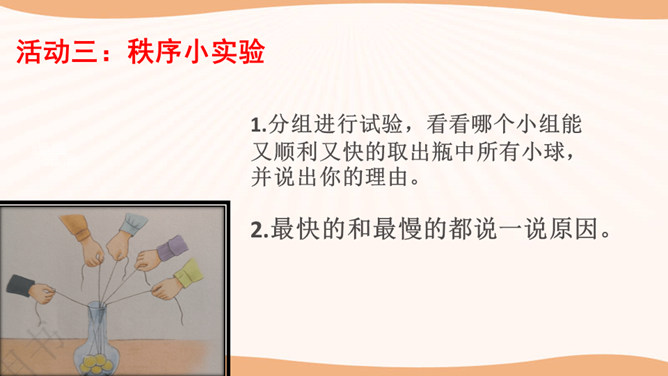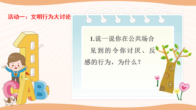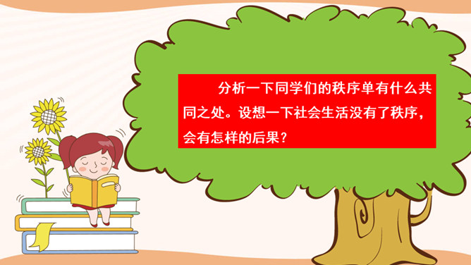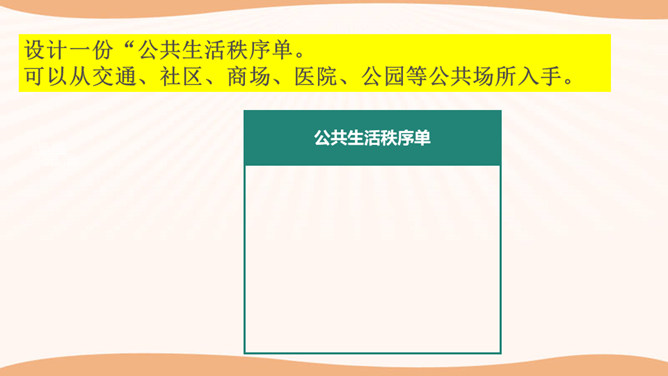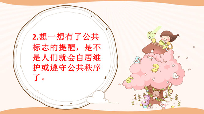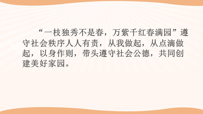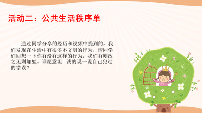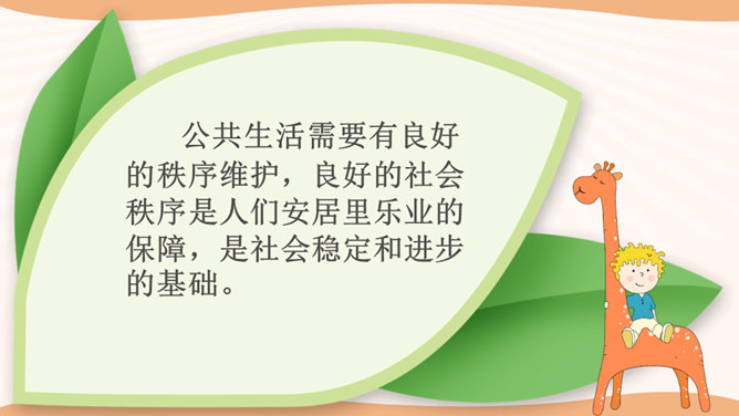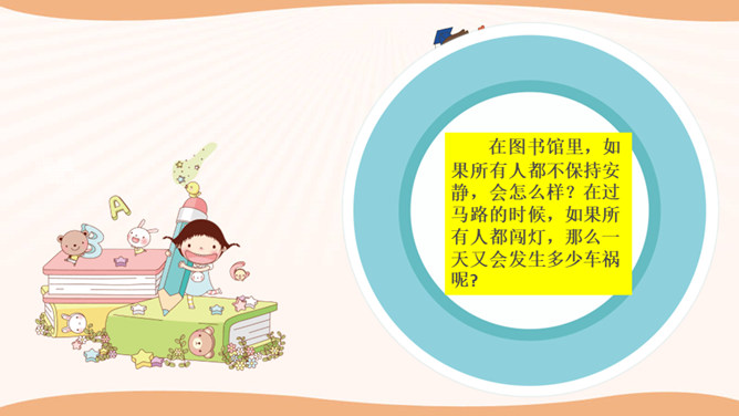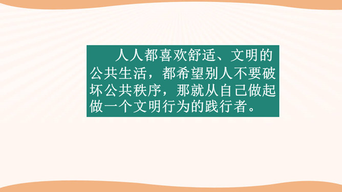 在图书馆里,如果所有人都不保持安静,会怎么样?在过马路的时候,如果所有人都闯灯,那么一天又会发生多少车祸呢?说一说你在公共场合见到的令你讨厌、反感的行为,为什么?通过同学分享的经历和视频中提到的,我们发现在生活中有很多不文明的行为,请同学们回想一下你有没有这样的行为,我们有则改之无则加勉。谁愿意坦诚的说一说自己犯过的错误?公共生活需要有良好的秩序维护,良好的社会秩序是人们安居里乐业的保障,是社会稳定和进步的基础。所属专题:建立良好的公共秩序ppt。