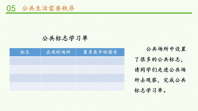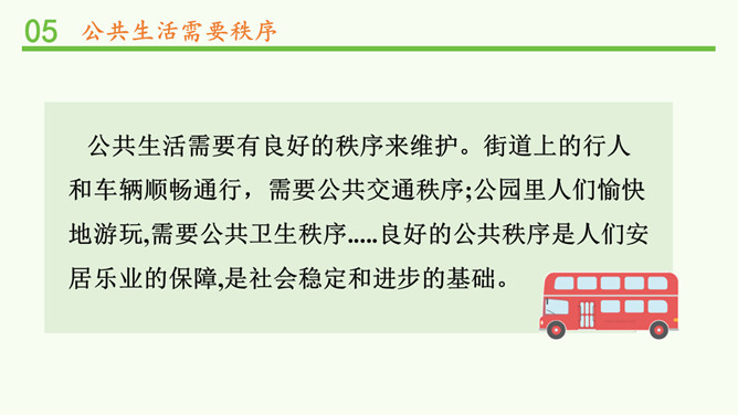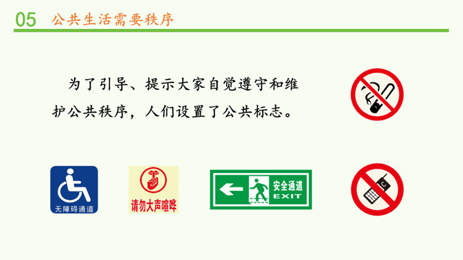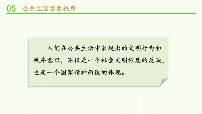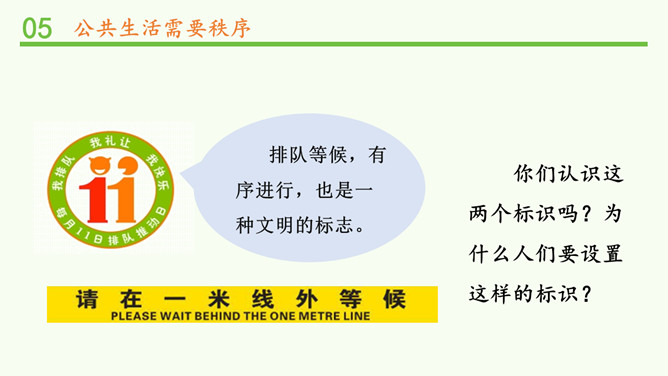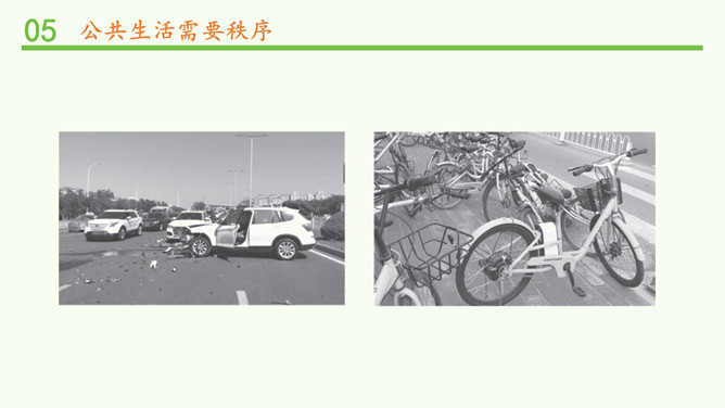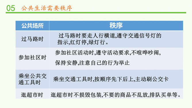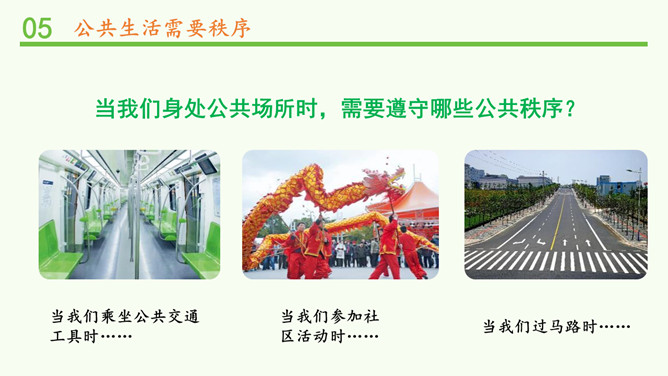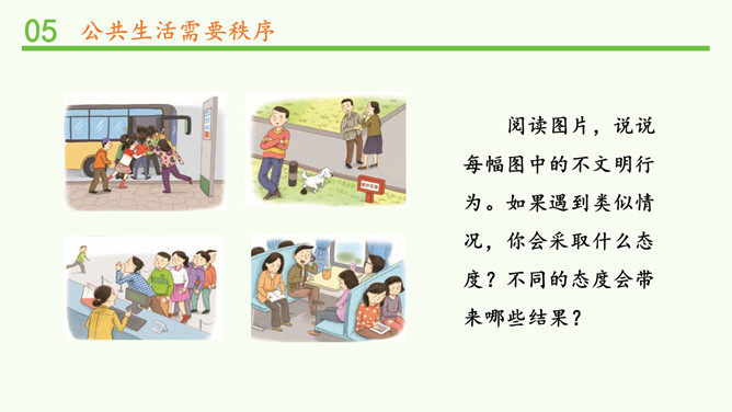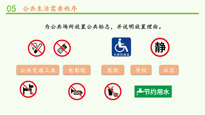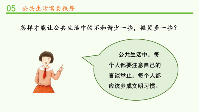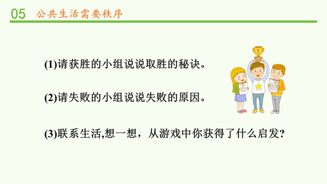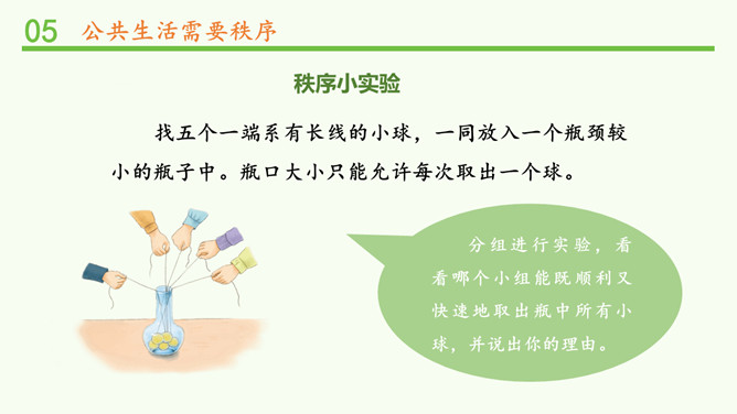 找五个一端系有长线的小球,一同放入一个瓶颈较小的瓶子中。瓶口大小只能允许每次取出一个球。分组进行实验,看看哪个小组能既顺利又快速地取出瓶中所有小球,并说出你的理由。(1)请获胜的小组说说取胜的秘诀。(2)请失败的小组说说失败的原因。(3)联系生活,想一想,从游戏中你获得了什么启发?参加社区活动时,遵守活动要求,不喧哗吵闹,保持安静,注意自己的行为举止。良好的公共秩序是人们安居乐业的保障,是社会稳定和进步的基础。怎样才能让公共生活中的不和谐少一些,微笑多一些?所属专题:建立良好的公共秩序ppt。