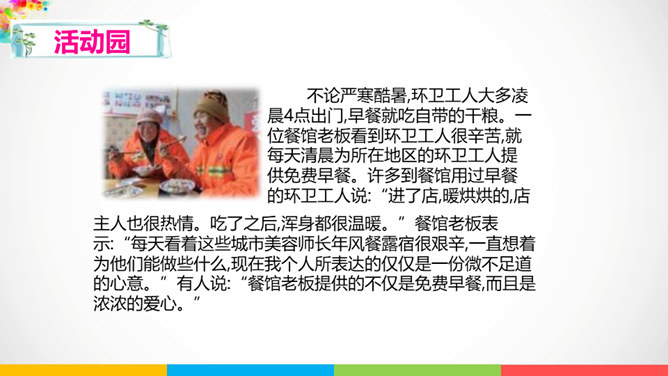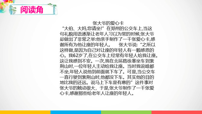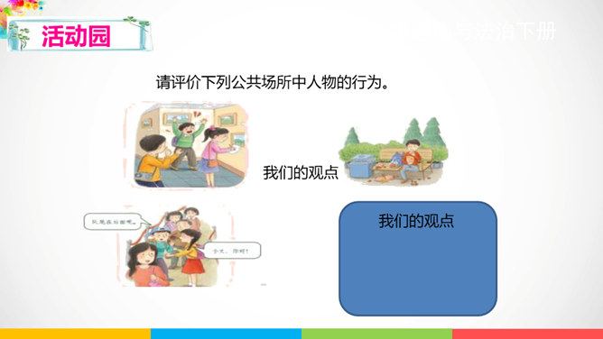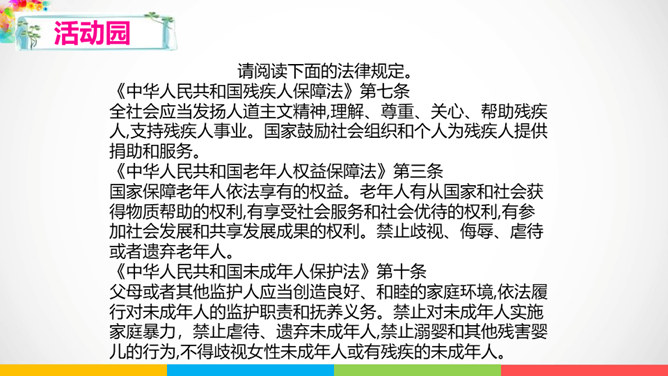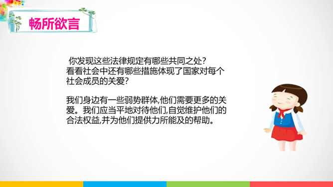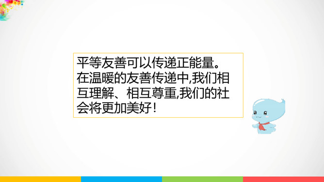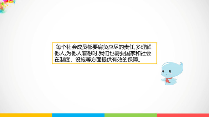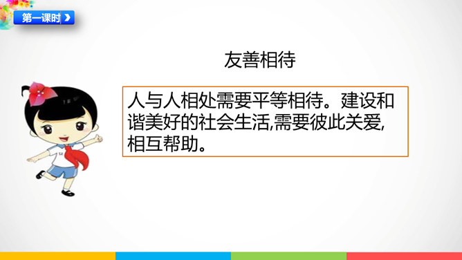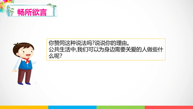 人与人相处需要平等相待。建设和谐美好的社会生活,需要彼此关爱,相互帮助。赞同这种说法吗?说说你的理由。公共生活中,我们可以为身边需要关爱的人做些什么呢?有秩序的公共生活会让社会环境更加舒适宜人,使我们感受到生活的美好,生活质量的提高。平等友善可以传递正能量。在温暖的友善传递中,我们相互理解、相互尊重,我们的社会将更加美好!每个社会成员都要肩负应尽的责任,多理解他人,为他人着想时,我们也需要国家和社会在制度、设施等方面提供有效的保障。所属专题:我参与我奉献ppt。