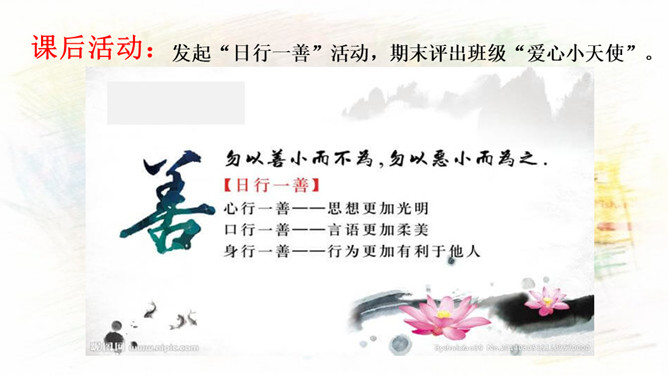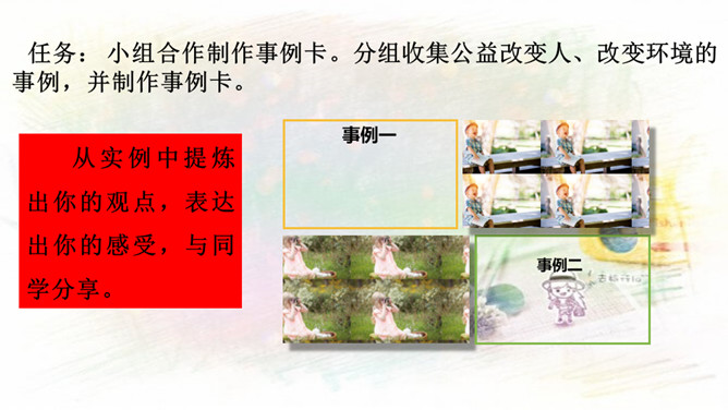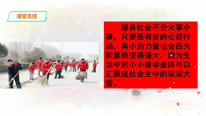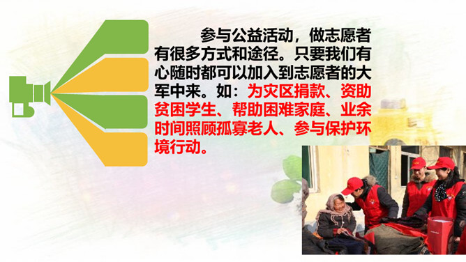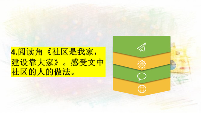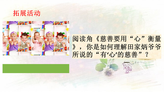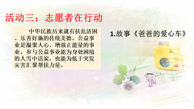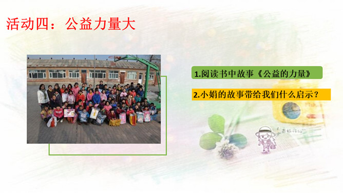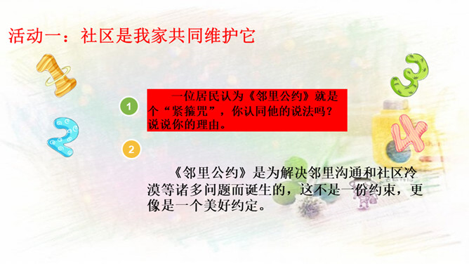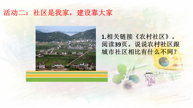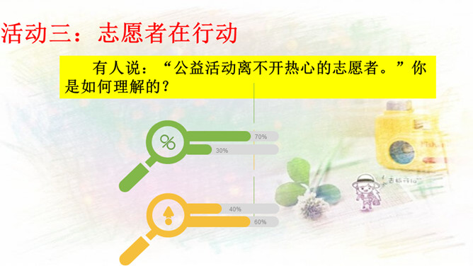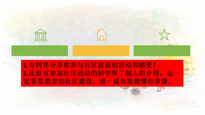 1.与同伴分享你参与社区建设的活动和感受!2.还没有参加社区活动的同学听了别人的介绍,也一定非常想参加社区建设,说一说你能做哪些事情。中华民族历来就有扶危济困、乐善好施的传统美德。公益事业是凝聚人心、增强正能量的事业。参与公益事业能为身处困境的人雪中送炭,也能为低于突发灾害汇聚帮扶力量。有人说:“公益活动离不开热心的志愿者。”你是如何理解的?参与公益活动,做志愿者有很多方式和途径。只要我们有心随时都可以加入到志愿者的大军中来。所属专题:我参与我奉献ppt。