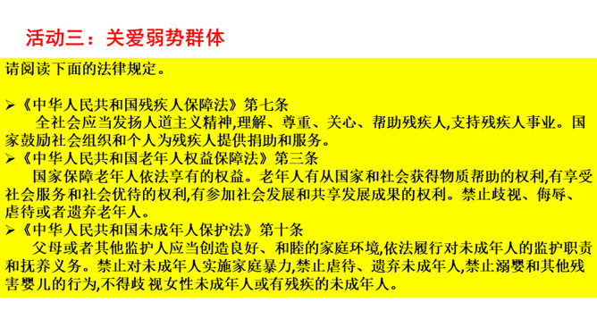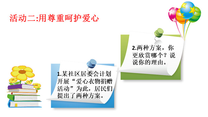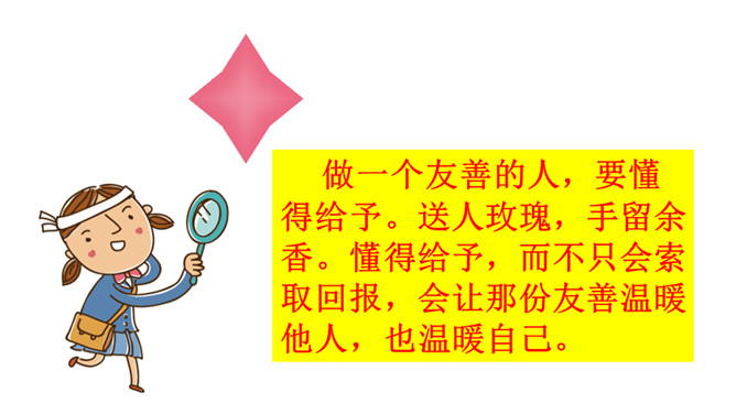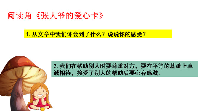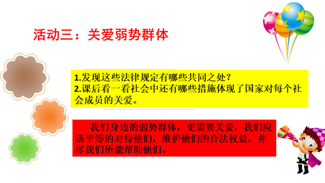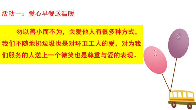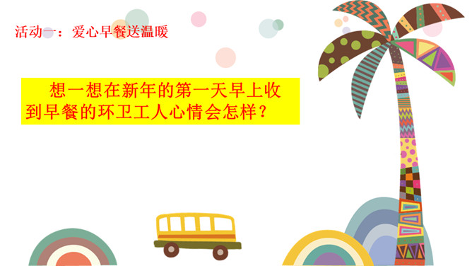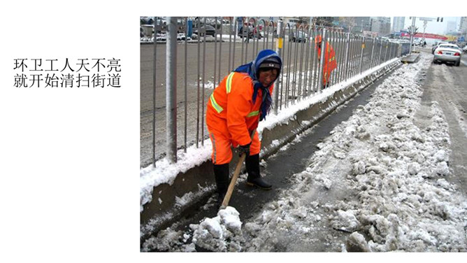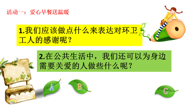 想一想在新年的第一天早上收到早餐的环卫工人心情会怎样?1.我们应该做点什么来表达对环卫工人的感谢呢?2.在公共生活中,我们还可以为身边需要关爱的人做些什么呢?勿以善小而不为,关爱他人有很多种方式,我们不随地扔垃圾也是对环卫工人的爱,对为我们服务的人送上一个微笑也是尊重与爱的表现。我们在帮助别人时要尊重对方,要在平等的基础上真诚相待,接受了别人的帮助后要心存感激。我们身边的弱势群体,更需要关爱,我们应该平等的对待他们,维护他们的合法权益,并尽我们所能帮助他们。所属专题:我参与我奉献ppt。