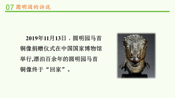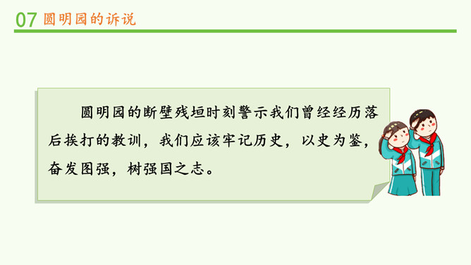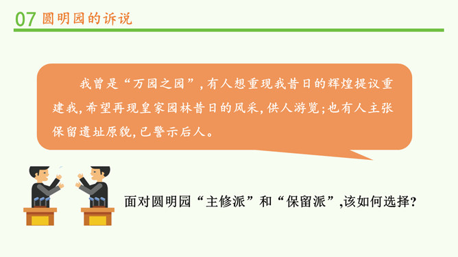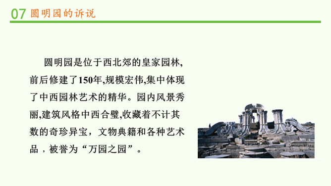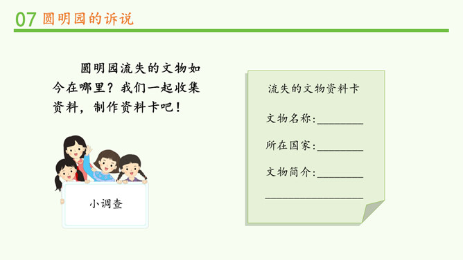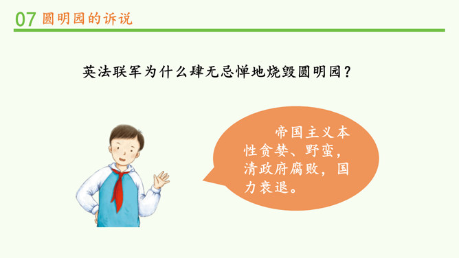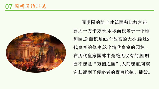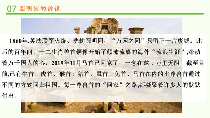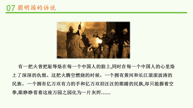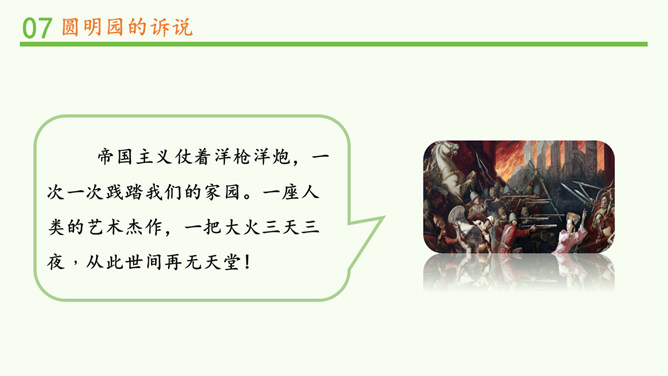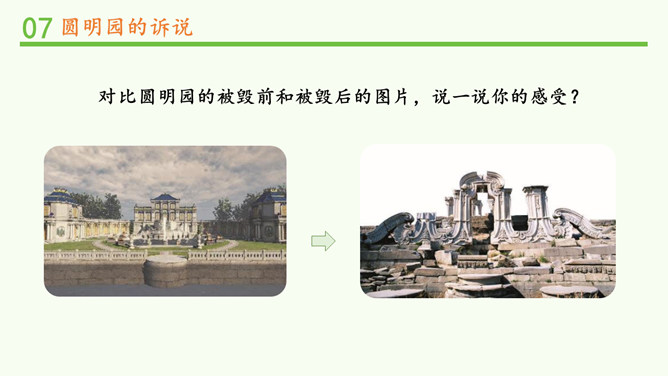 对比圆明园的被毁前和被毁后的图片,说一说你的感受?英法联军为什么肆无忌惮地烧毁圆明园?帝国主义本性贪婪、野蛮,清政府腐败,国力衰退。圆明园流失的文物如今在哪里?我们一起收集资料,制作资料卡吧!帝国主义仗着洋枪洋炮,一次一次践踏我们的家园。一座人类的艺术杰作,一把大火三天三夜,从此世间再无天堂!我曾是“万园之园”,有人想重现我昔日的辉煌提议重建我,希望再现皇家园林昔日的风采,供人游览;也有人主张保留遗址原貌,已警示后人。面对圆明园“主修派”和“保留派”,该如何选择?所属专题:不甘屈辱奋勇抗争ppt。