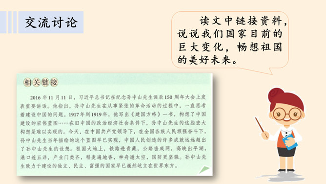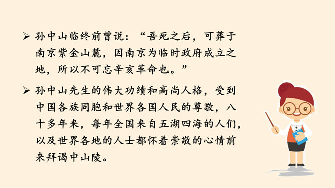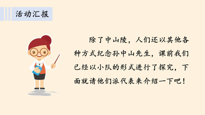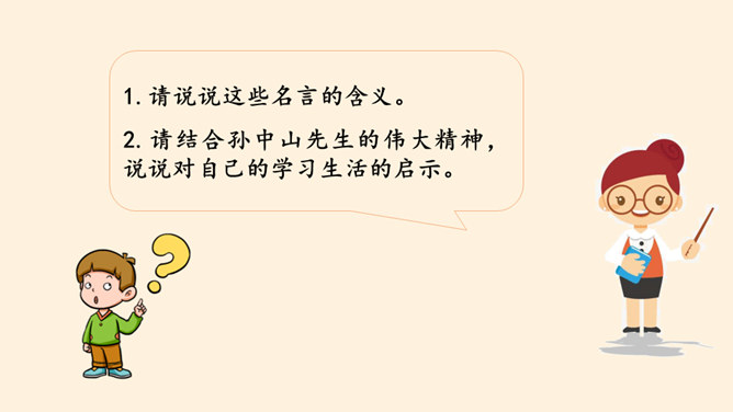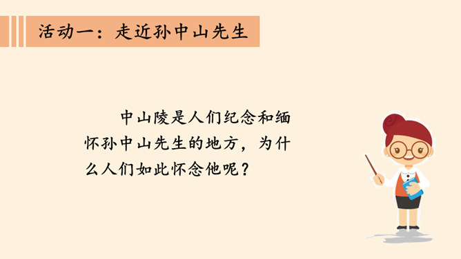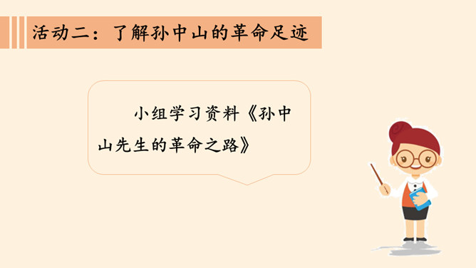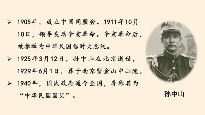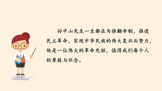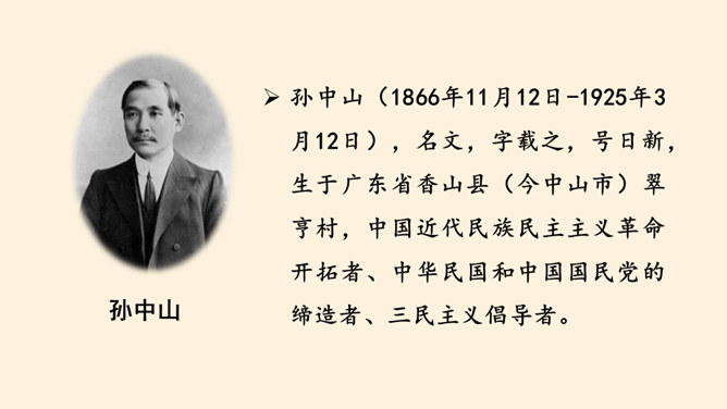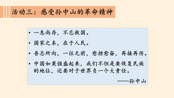 同学们,南京有个著名的景点叫中山陵,每天去参观游玩的人络绎不绝,你们去过吗?谁能和大家介绍一下吗?中山陵是人们纪念和缅怀孙中山先生的地方,为什么人们如此怀念他呢?除了中山陵,人们还以其他各种方式纪念孙中山先生,课前我们已经以小队的形式进行了探究,下面就请他们派代表来介绍一下吧!孙中山先生一生都在为推翻帝制,推进民主革命,实现中华民族的伟大复兴而努力,他是一位伟大的革命先驱,值得我们每个人的尊敬与怀念。请结合孙中山先生的伟大精神,说说对自己的学习生活的启示。所属专题:推翻帝制民族觉醒ppt。