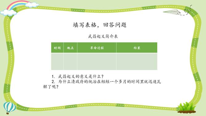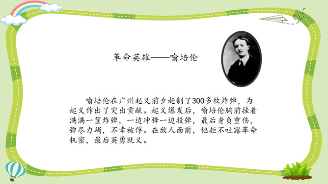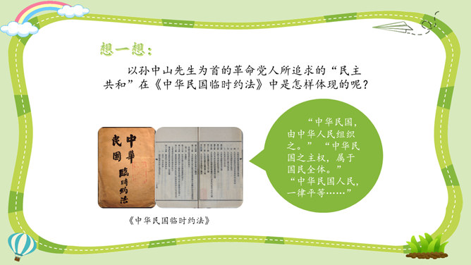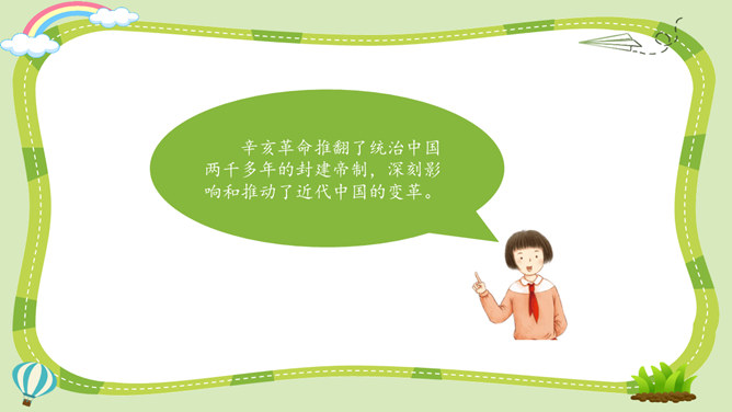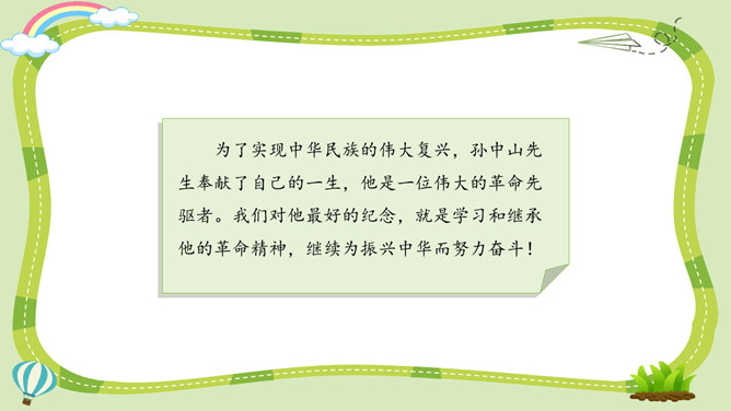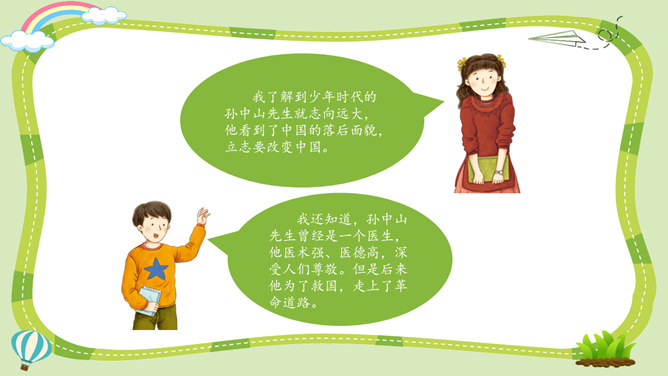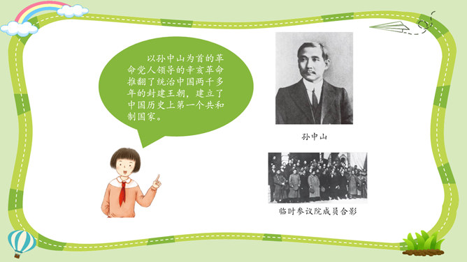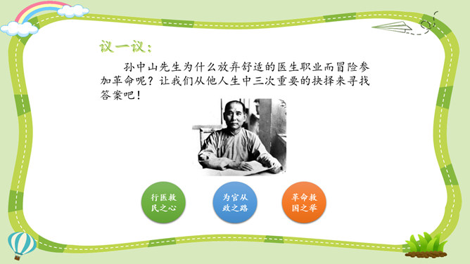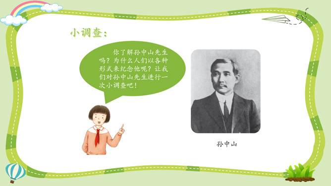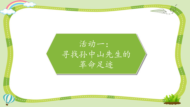 活动一:寻找孙中山先生的革命足迹。你了解孙中山先生吗?为什么人们以各种形式来纪念他呢?让我们对孙中山先生进行一次小调查吧!我了解到少年时代的孙中山先生就志向远大,他看到了中国的落后面貌,立志要改变中国。我还知道,孙中山先生曾经是一个医生,他医术强、医德高,深受人们尊敬。但是后来他为了救国,走上了革命道路。以孙中山为首的革命党人领导的辛亥革命推翻了统治中国两千多年的封建王朝,建立了中国历史上第一个共和制国家。孙中山先生为什么放弃舒适的医生职业而冒险参加革命呢?所属专题:推翻帝制民族觉醒ppt。