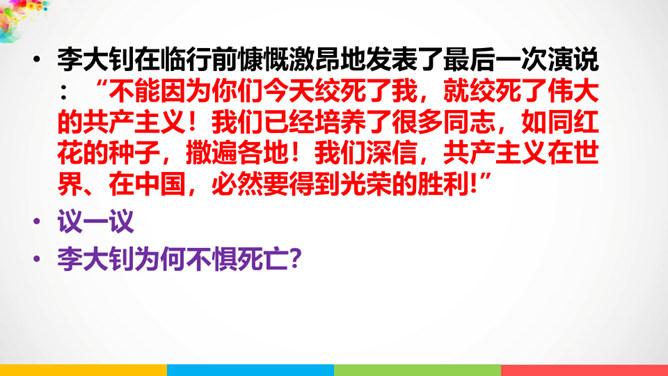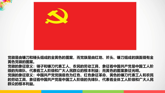 党徽是由镰刀和锤头组成的金黄色的图案,而党旗是由红地、斧头、镰刀组成的旗面缀有金黄色党徽的图案。党徽的象征意义:锤子和镰刀代表工人、农民的劳动工具,象征着中国共产党是中国工人阶级的先锋队,代表着工人阶级和广大人民群众的根本利益;而黄色的图案象征光明。党旗的象征意义:中国共产党党旗底色为红色,红色象征革命,黄色的镰刀代表工人和农民的劳动工具,象征着中国共产党是中国工人阶级的先锋队,代表着全体工人阶级和广大人民群众的根本利益。所属专题:中国有了共产党ppt。