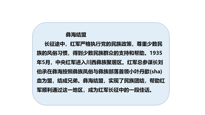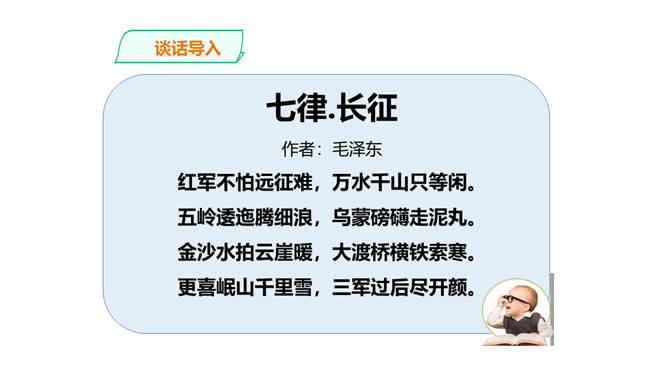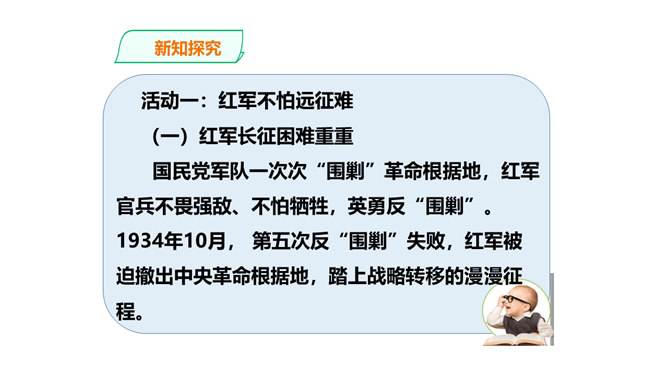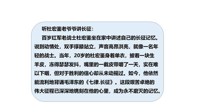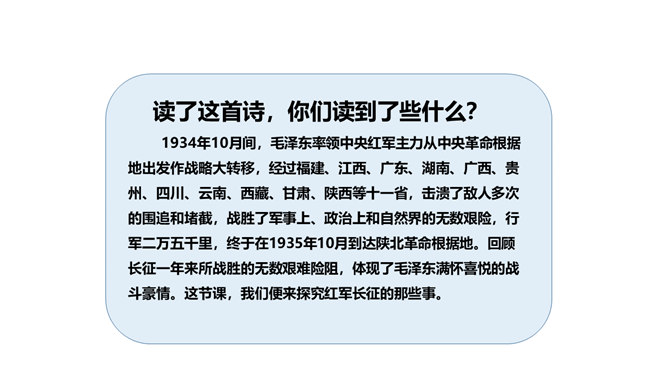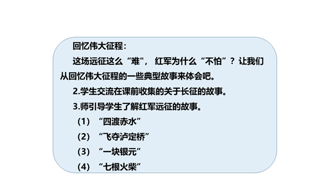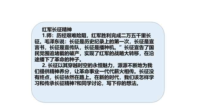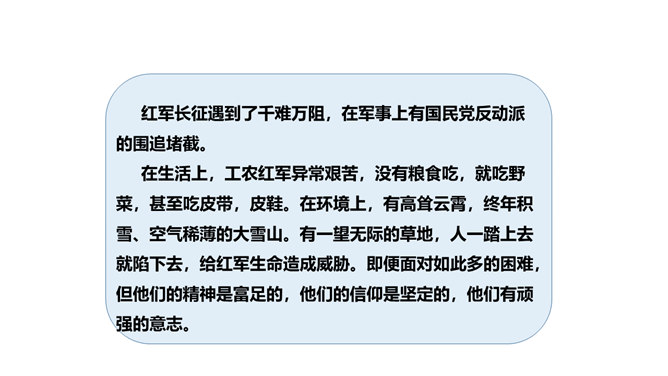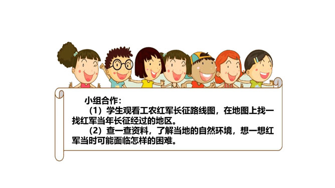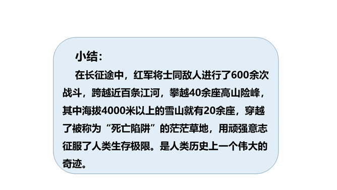 长征精神就是要有坚定的信念,要有吃苦耐劳的决心,要做到人民利益、国家利益、民族利益高于一切,集体利益高于个人利益,全局利益高于局部利益的精神。我们作为新时代的学生,要以红军长征精神严格要求自己,学生传承和发扬长征精神。举世闻名的长征,是中国共产党和红军谱写的壮丽史诗,铸就了不怕牺牲、百折不挠、浴血奋战、勇往直前的长征精神。伟大的长征精神,凝聚着中国共产党为实现崇高理想而卓绝奋斗的坚定信念,凝聚着人民军队不断走向胜利的坚强意志,凝聚着中华民族不懈奋斗、自强不息的伟大品格。所属专题:中国有了共产党ppt。