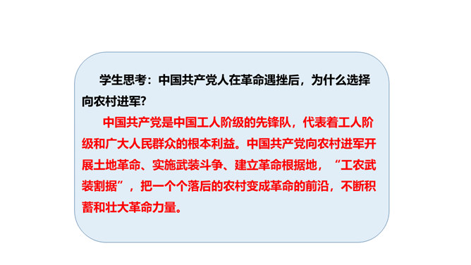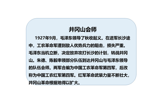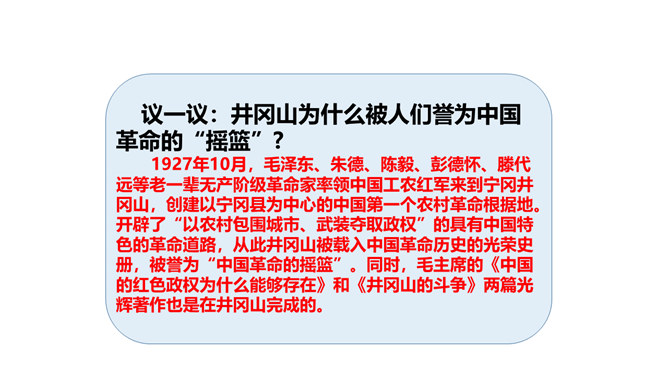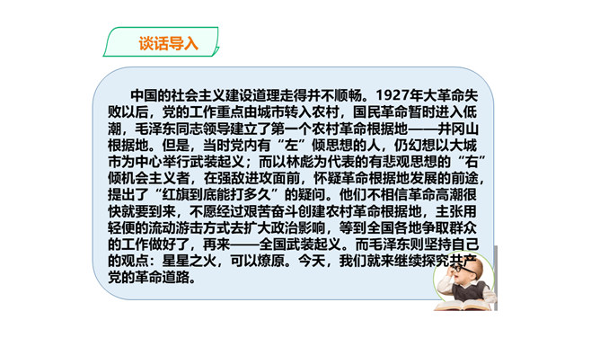 中国的社会主义建设道理走得并不顺畅。1927年大革命失败以后,党的工作重点由城市转入农村,国民革命暂时进入低潮,毛泽东同志领导建立了第一个农村革命根据地——井冈山根据地。但是,当时党内有“左”倾思想的人,仍幻想以大城市为中心举行武装起义;而以林彪为代表的有悲观思想的“右”倾机会主义者,在强敌进攻面前,怀疑革命根据地发展的前途,提出了“红旗到底能打多久”的疑问。他们不相信革命高潮很快就要到来,不愿经过艰苦奋斗创建农村革命根据地,主张用轻便的流动游击方式去扩大政治影响,等到全国各地争取群众的工作做好了,再来——全国武装起义。所属专题:中国有了共产党ppt。