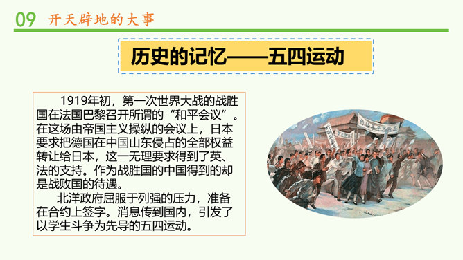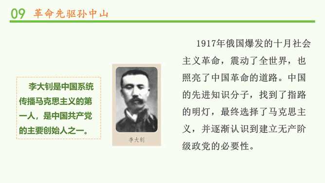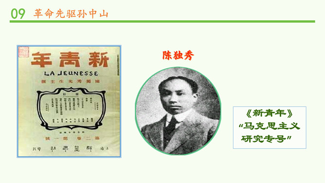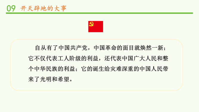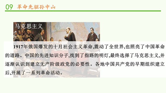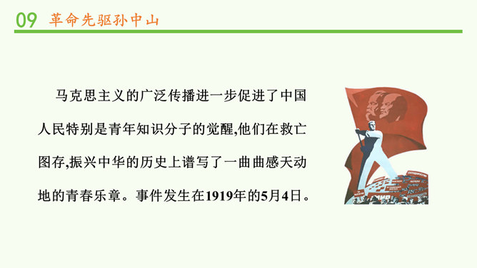马克思主义的广泛传播进一步促进了中国人民特别是青年知识分子的觉醒,他们在救亡图存,振兴中华的历史上谱写了一曲曲感天动地的青春乐章。事件发生在1919年的5月4日。1917年俄国爆发的十月社会主义革命,震动了全世界,也照亮了中国革命的道路。中国的先进知识分子,找到了指路的明灯,最终选择了马克思主义,并逐渐认识到建立无产阶级政党的必要性。各地中国共产党的早期组织建立后,开展了一系列革命活动。自从有了中国共产党,中国革命的面目就焕然一新;它不仅代表工人阶级的利益,还代表中国广大人民和整个中华民族的利益。所属专题:中国有了共产党ppt。